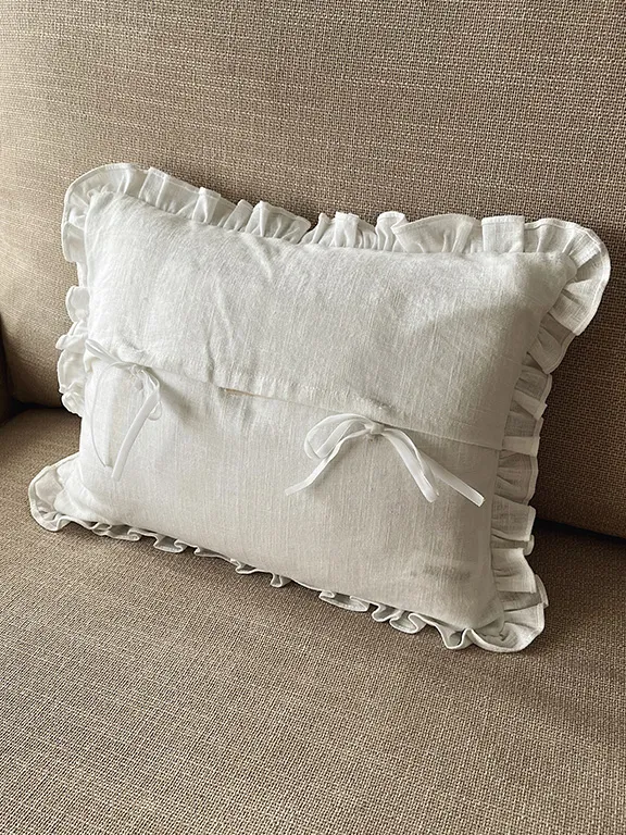 Cojín confeccionado artesanalmente en un taller de Madrid. Tela de lino lavado de estilo rústico, elegida por su suavidad y textura natural.