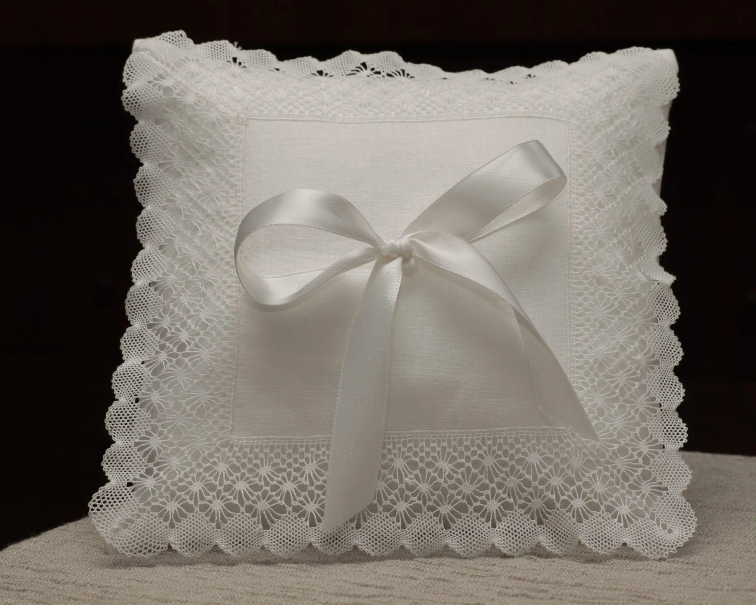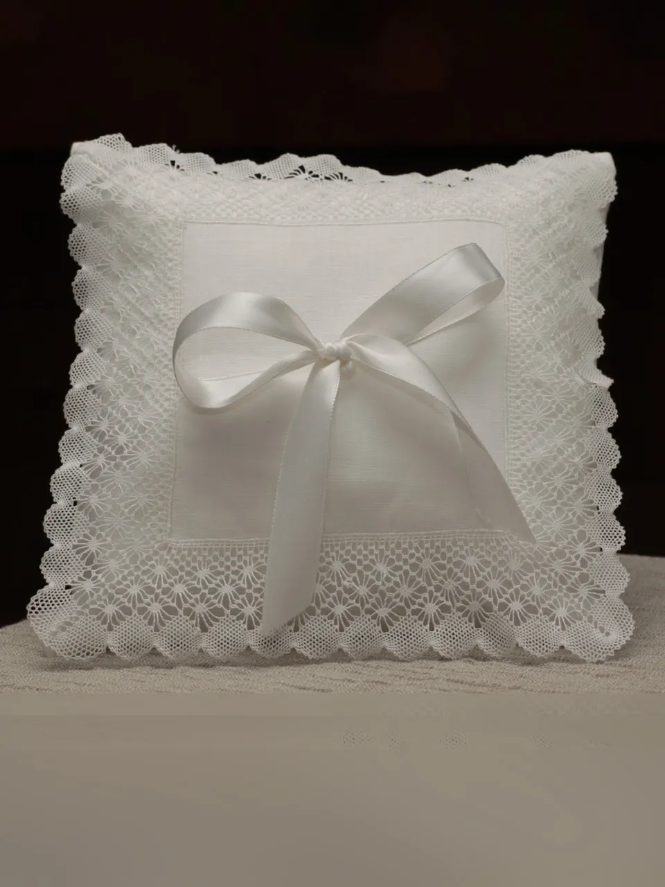 Elaborado artesanalmente en batista de lino blanco con encaje de bolillos y lazo de satén.