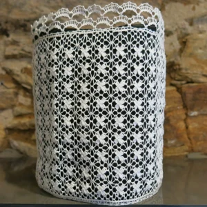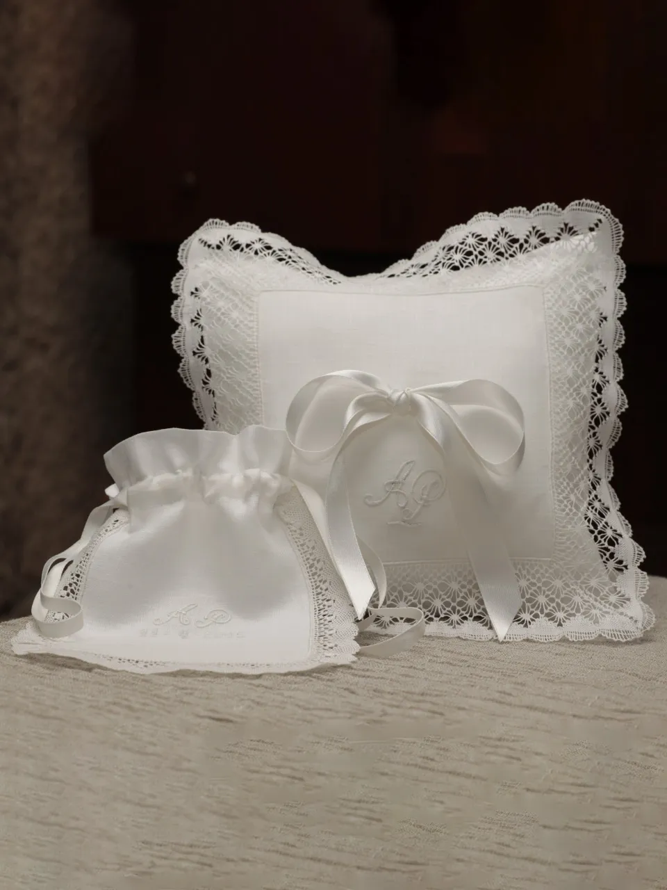 Estas dos piezas, al igual que el pañuelo de novia, han sido elaboradas en lino blanco con encaje de bolillos y lazo de satén. Por tratarse de una pieza personalizada la hacemos por encargo, pudiendo de este modo elegir otro tipo de tejido como organdí, tul, batista o seda.
