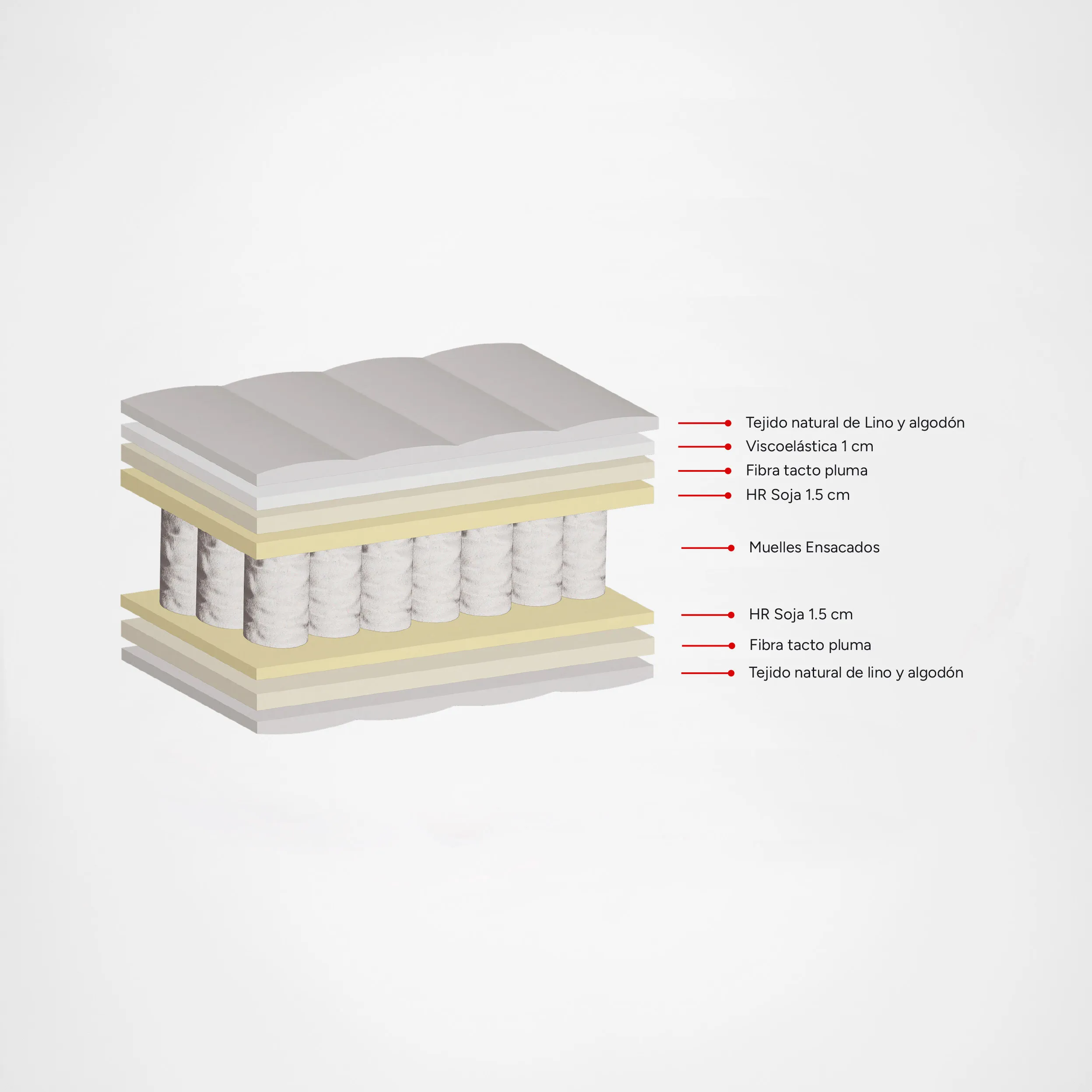 El colchón Nami con núcleo de muelles embolsados independientes te ofrece un 40% más de ventilación para un confort transpirable. Se adapta al peso de cada persona y ofrece máxima adaptación lumbar. Su tejido Stretch de lino y algodón aporta una frescura incomparable, absorbe el exceso de sudor y disipa electricidad estática para un descanso sin contratiempos.