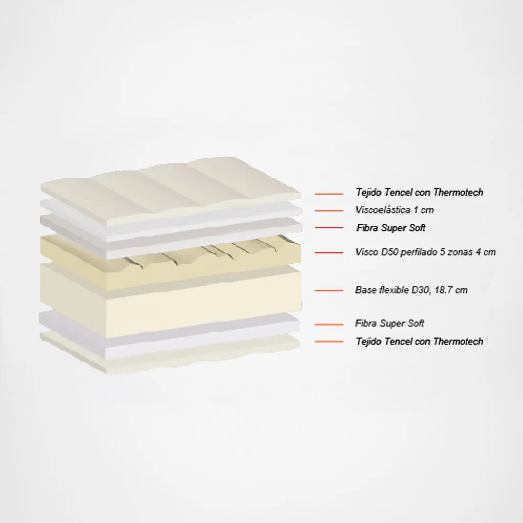 El colchón viscoelástico Dosiconfort incorpora un núcleo viscoelástico perfilado D50 con 5 zonas de confort, variando la dureza según las partes del cuerpo. Cuenta con cámaras de aire internas que mantienen el núcleo ventilado y reducen la proliferación bacteriana. Su base flexible de espuma de alta densidad recupera la forma original tras largos periodos de uso, ofreciendo un soporte óptimo y firmeza durante su vida útil.