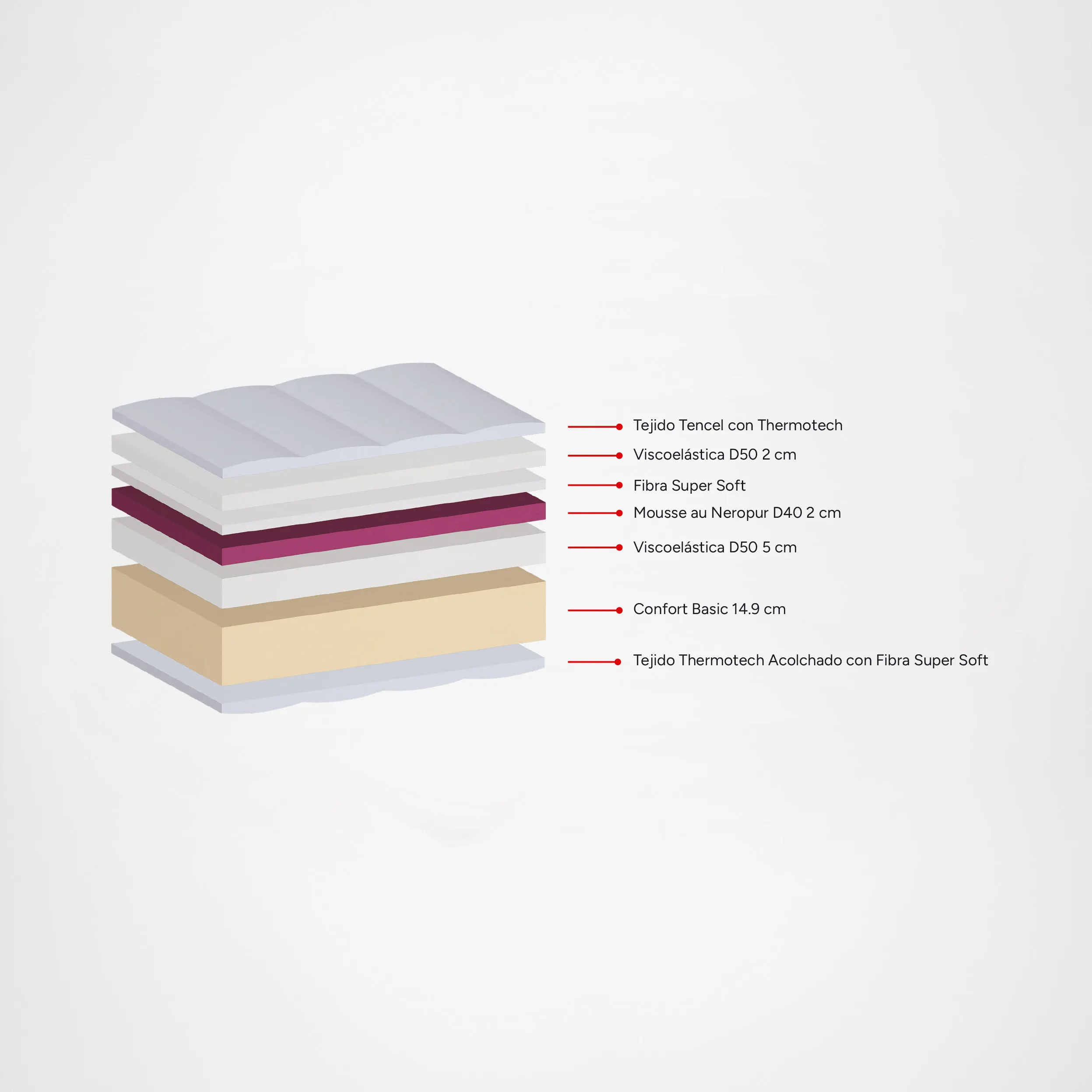 El colchón Kyoto presenta un suave tejido Stretch con Tencel y un acolchado de 2 cm de viscoelástica para una sensación suave y alta transpirabilidad mientras descansas. Incorpora el termo-regulador Thermotech que, gracias a sus microcápsulas, ajusta la temperatura corporal para obtener frescura en verano y calidez en invierno. La Mousse au Neropur brinda suavidad y bienestar emocional con aceite de nerolí, de color violeta para un sueño sedante según el Feng Shui. Sus espumas elásticas y transpirables aseguran indeformabilidad y el sistema StratoPlus, con capas de diferentes durezas, se adapta al cuerpo eliminando puntos de presión para un descanso reparador de alta calidad.