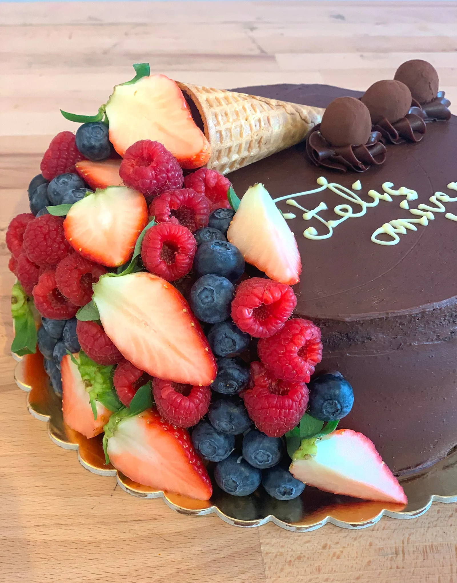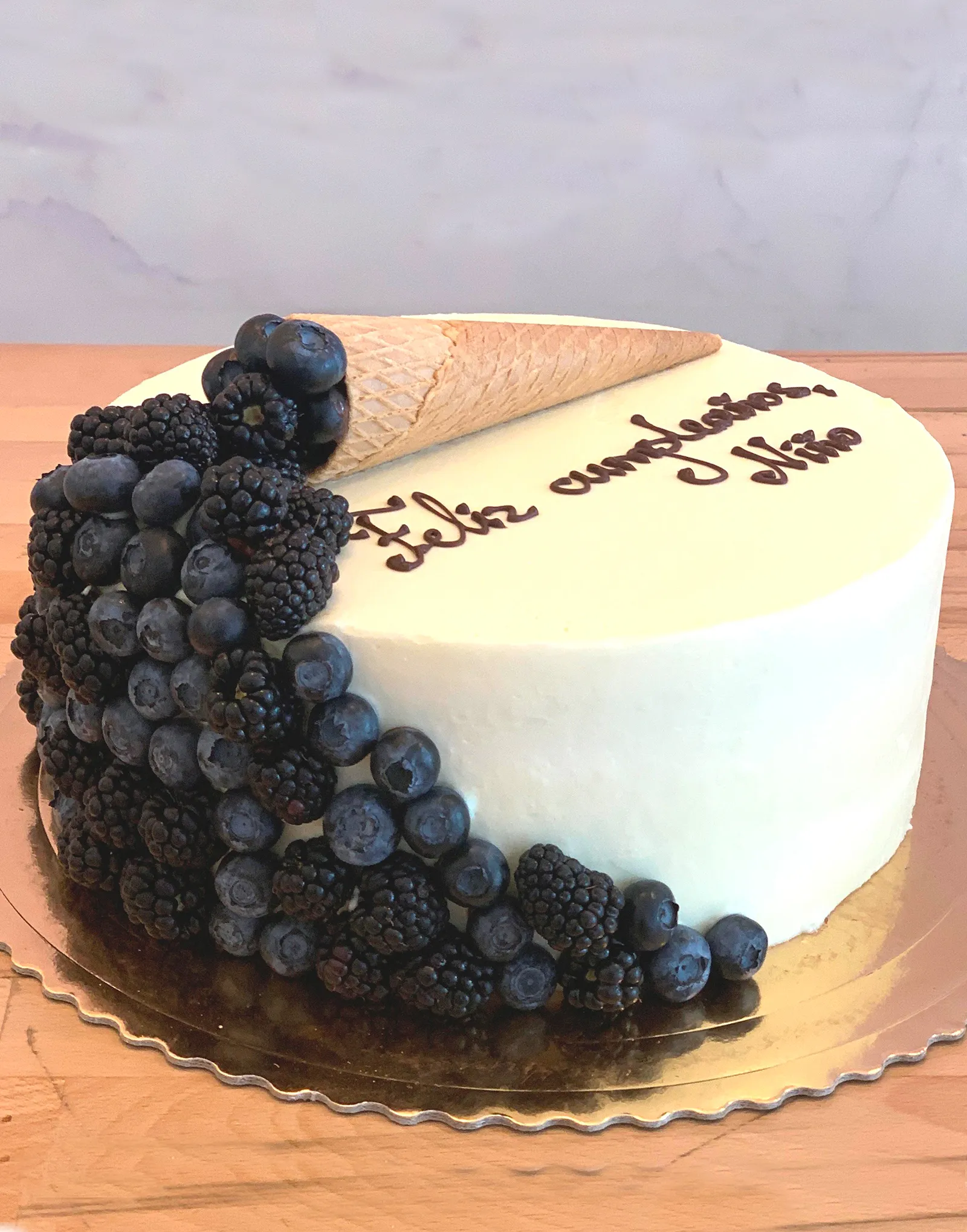 Decora el cono de frutas con la decoración clásica de nuestros pasteles. Elige el sabor, tamaño y color de la crema. La mix de frutas depende del temporada. No te olvides dejarnos un comentario si quieres que la tarta lleve algún escrito.Disfruta delcono de frutas