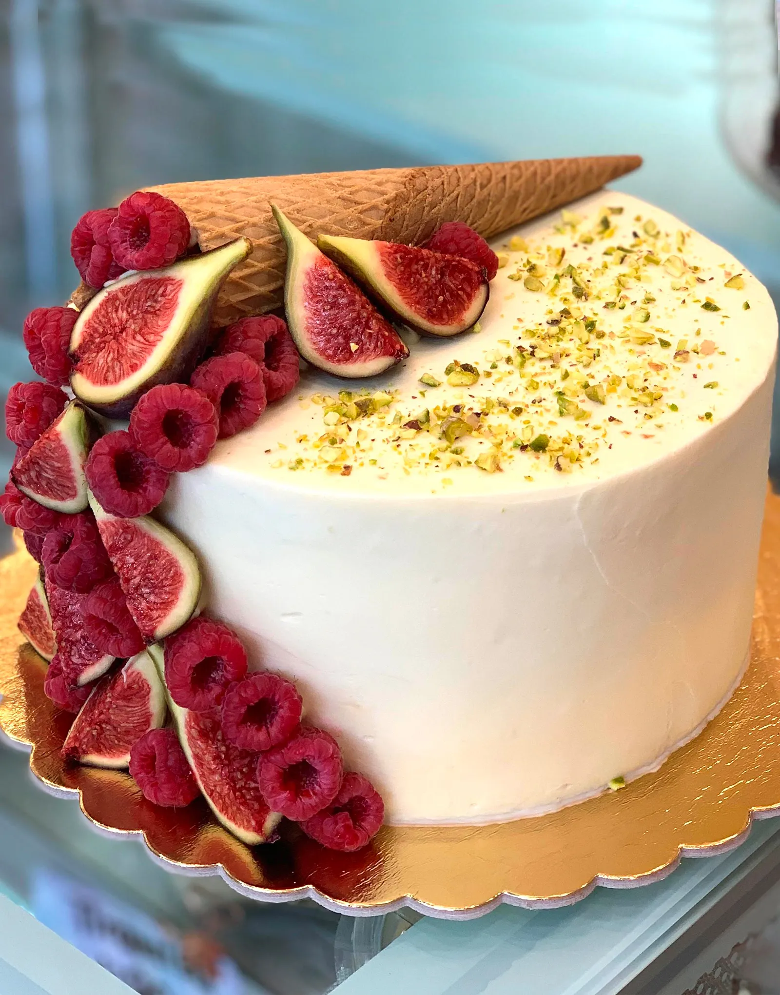 - Tarta de pistacho y cardamomo: Tamaño pequeño: 6 raciones / Tamaño grande: 10-12 raciones