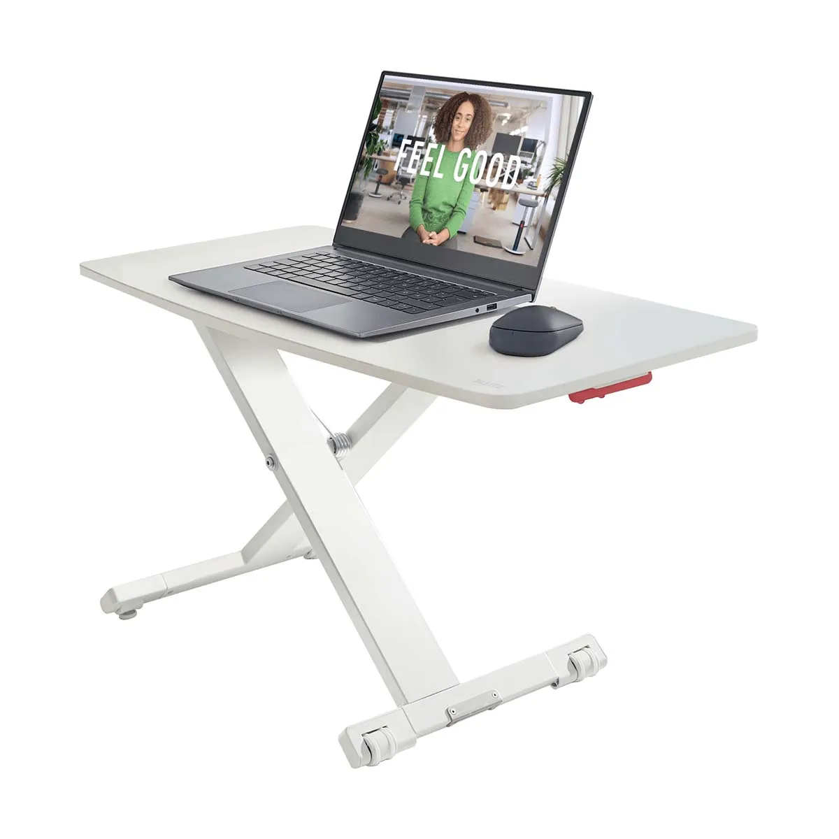 El Leitz Ergo Cosy Standing Desk Converter permite la flexibilidad de moverse entre sentado y de pie en su espacio de trabajo y, con su tamaño compacto y portátil, crea una configuración ergonómica en cualquier lugar.
