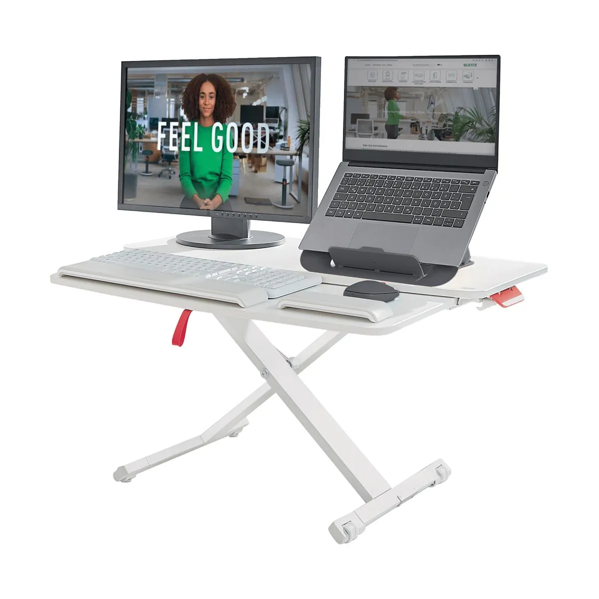 El convertidor de escritorio Leitz Ergo Cosy con bandeja deslizante para teclado y ratón permite la flexibilidad de moverse entre estar sentado y de pie mientras trabajas, fomentando el movimiento muscular, mejorando la postura y aumentando los niveles de energía.