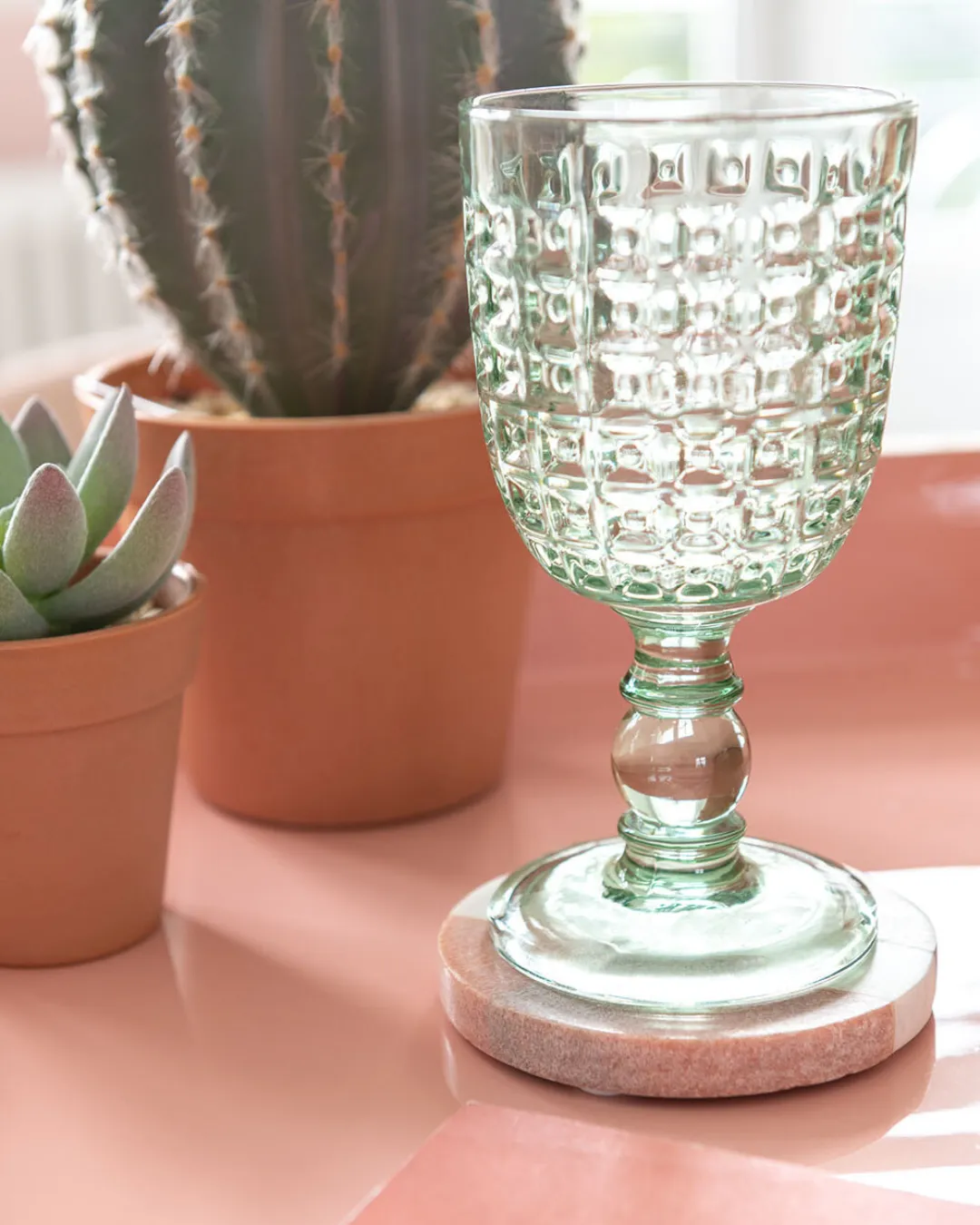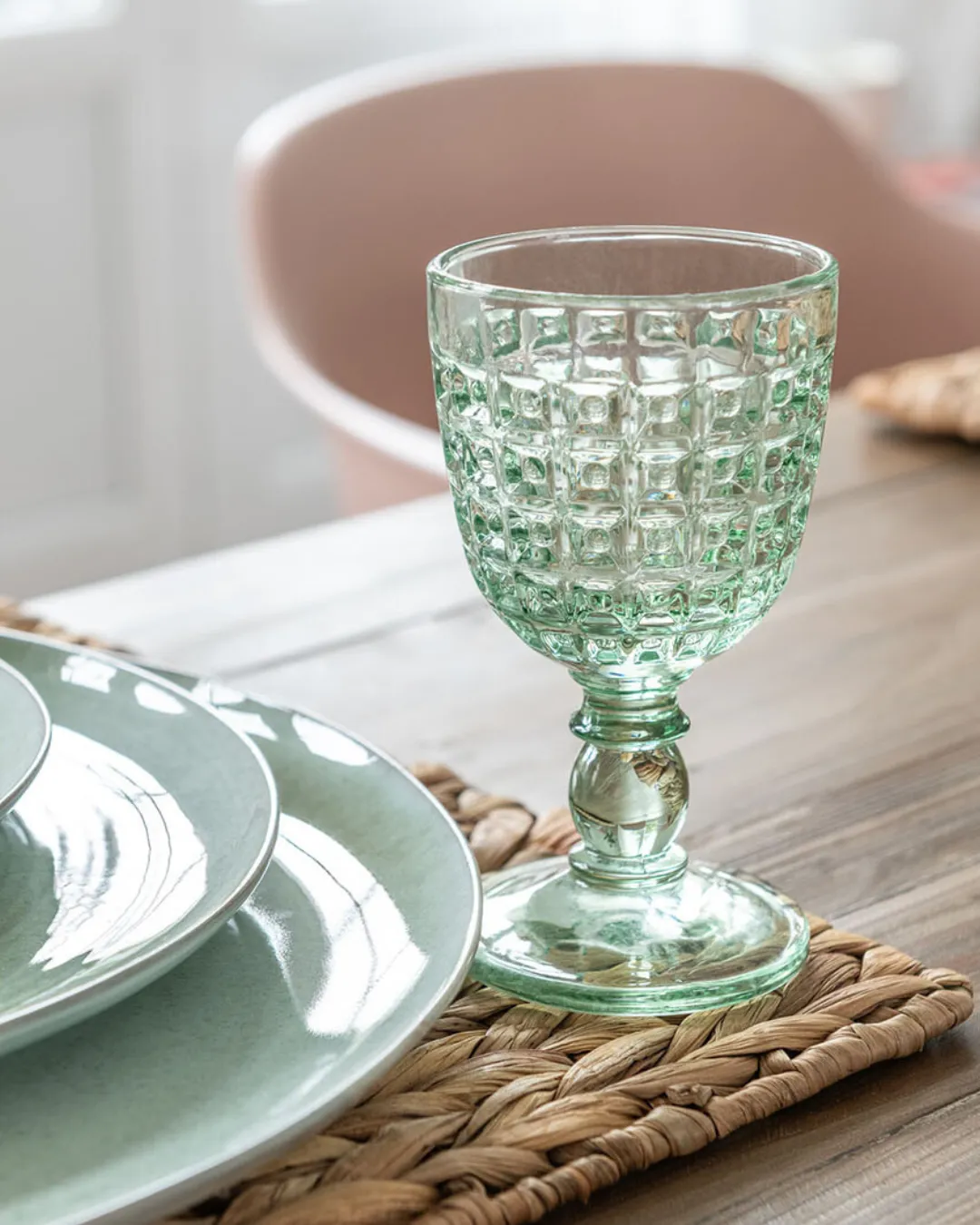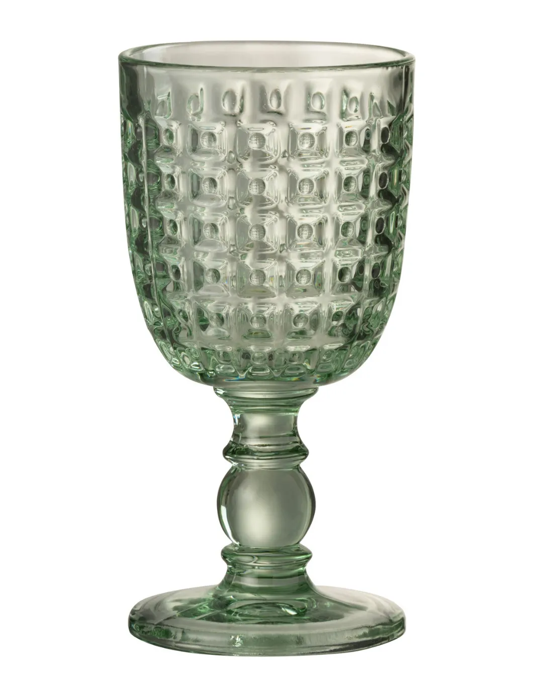 Copa de cristal larga con relieve en color verde. Medidas 8 x 8 x 17 cm.