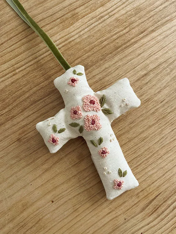 Cruz bordada con florecitas. Ideal para poner en la cunita del bebé, el moisés y la camita de los niños. Un detalle precioso para regalar a los más pequeños de la casa.