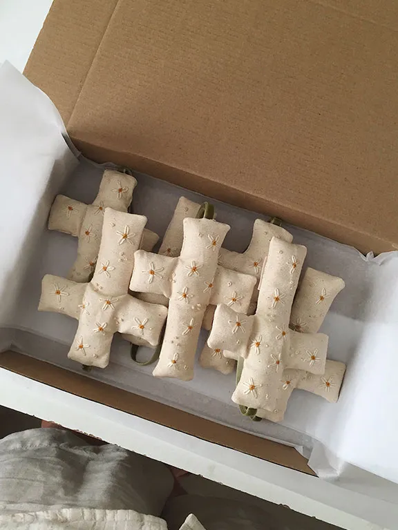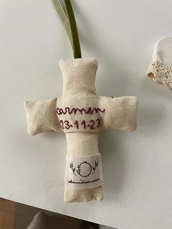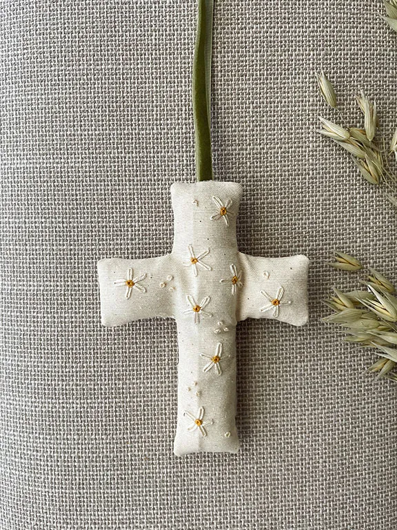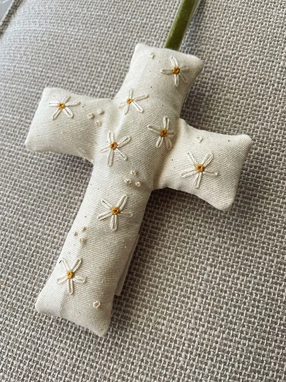 Cruz bordada con florecitas. Ideal para poner en la cunita del bebé, el moisés y la camita de los niños. Un detalle precioso para regalar a los más pequeños de la casa.