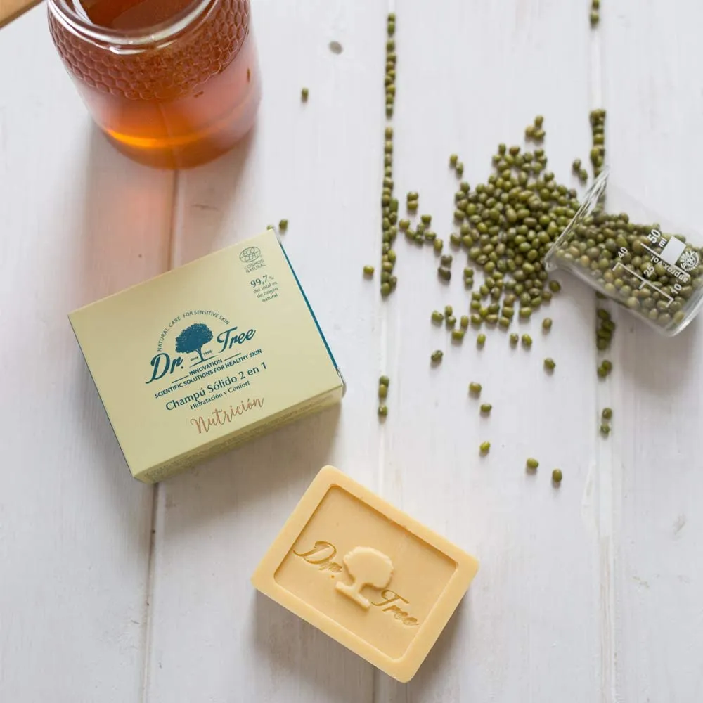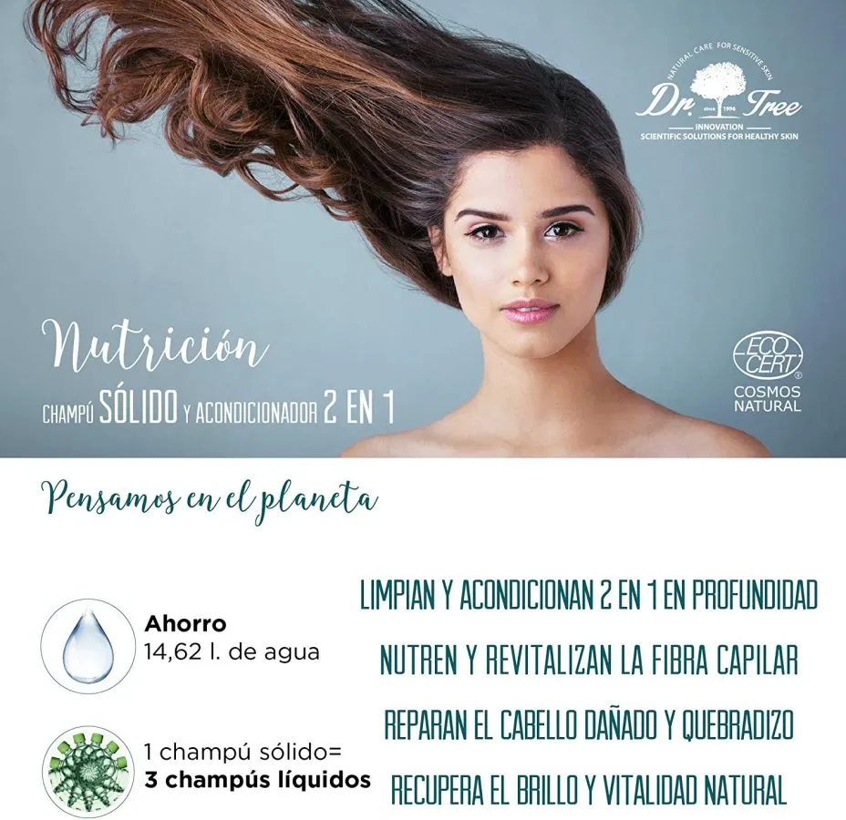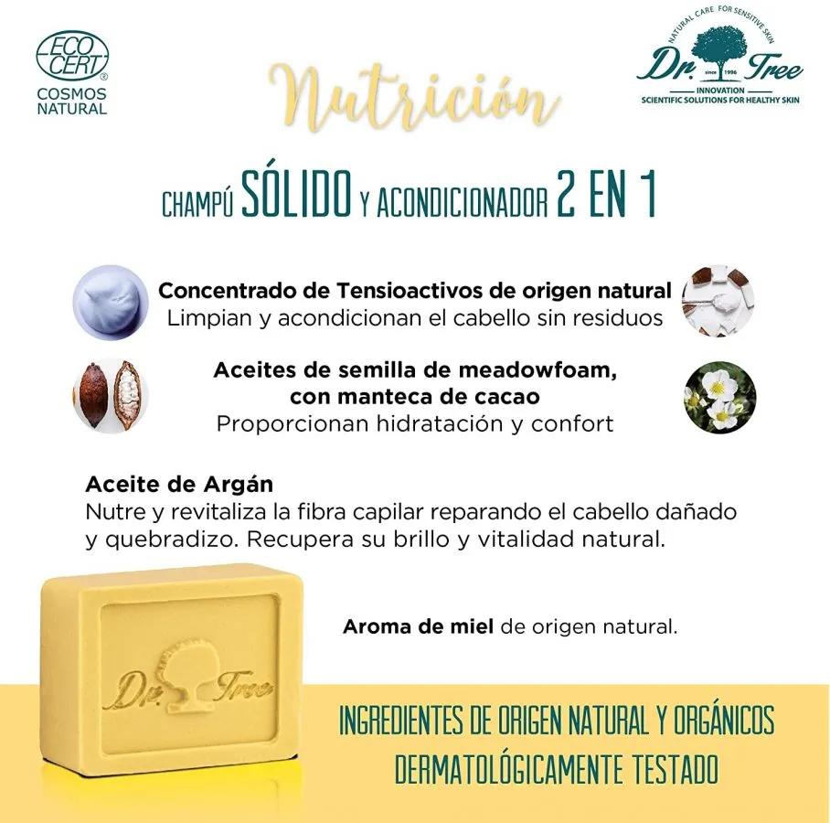 Champú sólido 2 en 1 Nutrición. Con Aceite de Argán altamente concentrado en ácido oléico, vitamina E y A. Nutre y revitaliza la fibra capilar, reparando el cabello dañado y quebradizo. El cabello recupera su brillo y vitalidad natural. Aroma de Miel de origen natural.