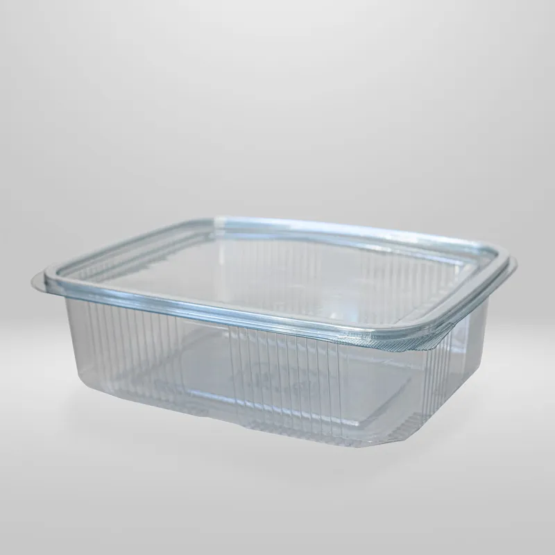 Fabricado con PET de alta calidad y apto para uso alimentario, este envase cumple con los estándares más exigentes de calidad e higiene. Su tapa bisagra asegura un cierre hermético, manteniendo tus alimentos frescos por más tiempo y evitando derrames no deseados.