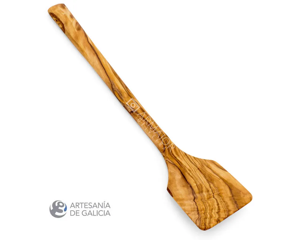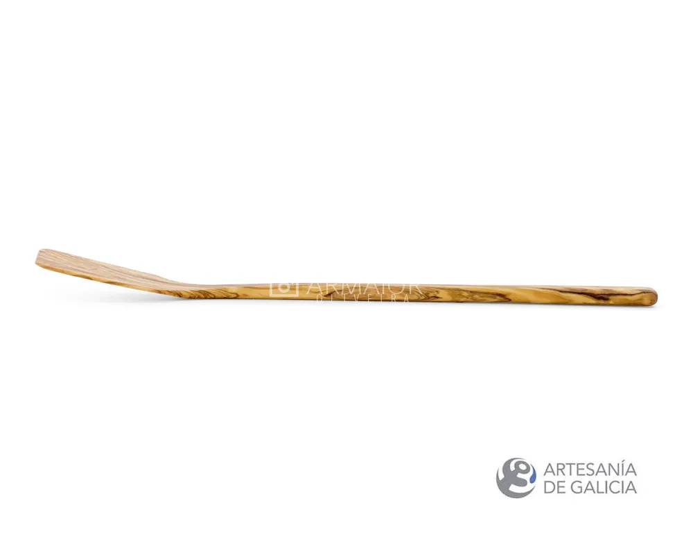 Espátula curva extralarga de cocina hecha a mano en madera de olivo. Para mezclar y trabajar guisos, salsas y todas tus demás preparaciones sin rallar las sartenes ni las ollas. El tamaño extralargo está indicado evitar salpicaduras y no quemarse al usar ollas grandes.