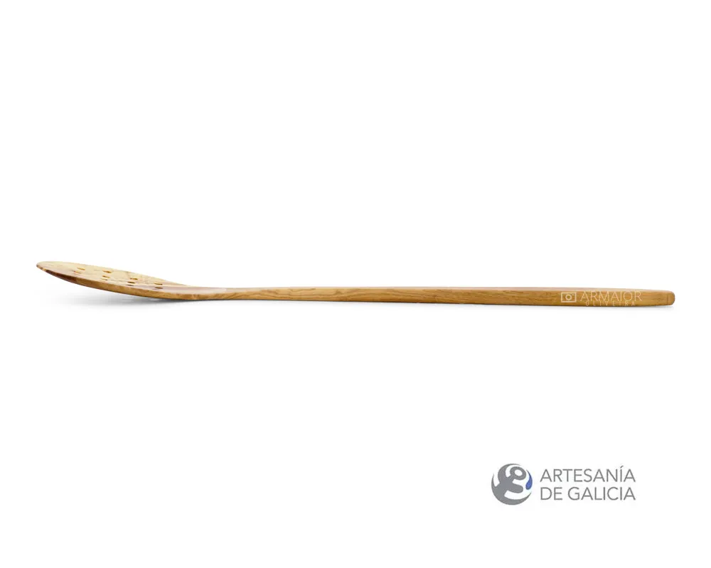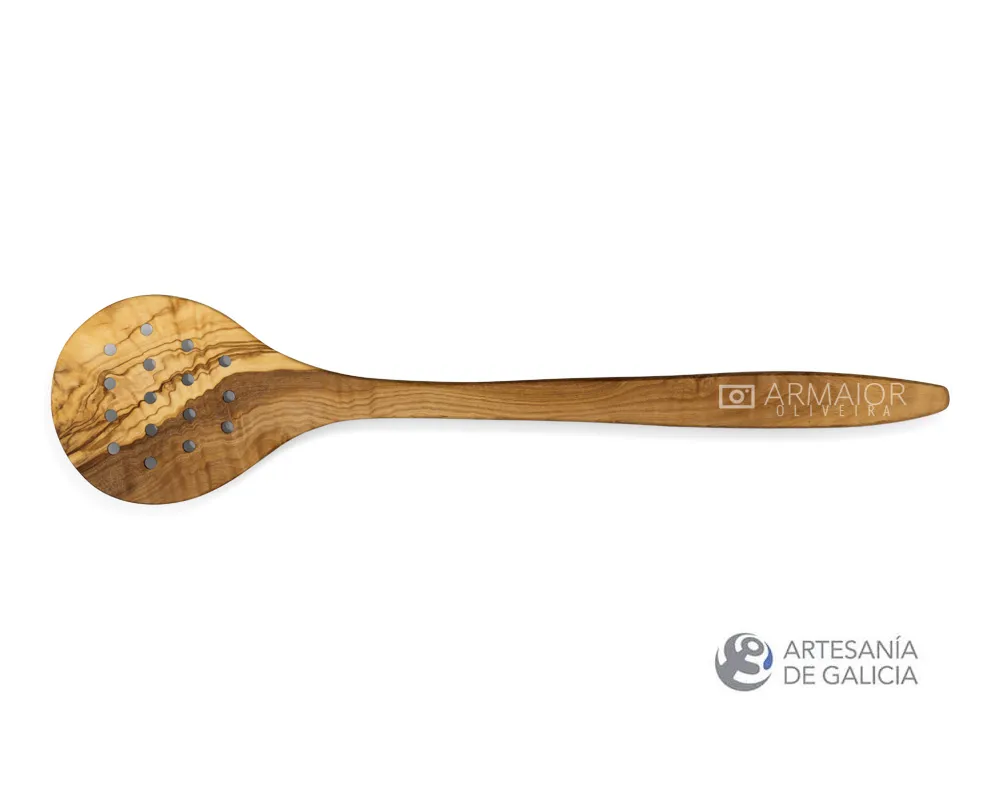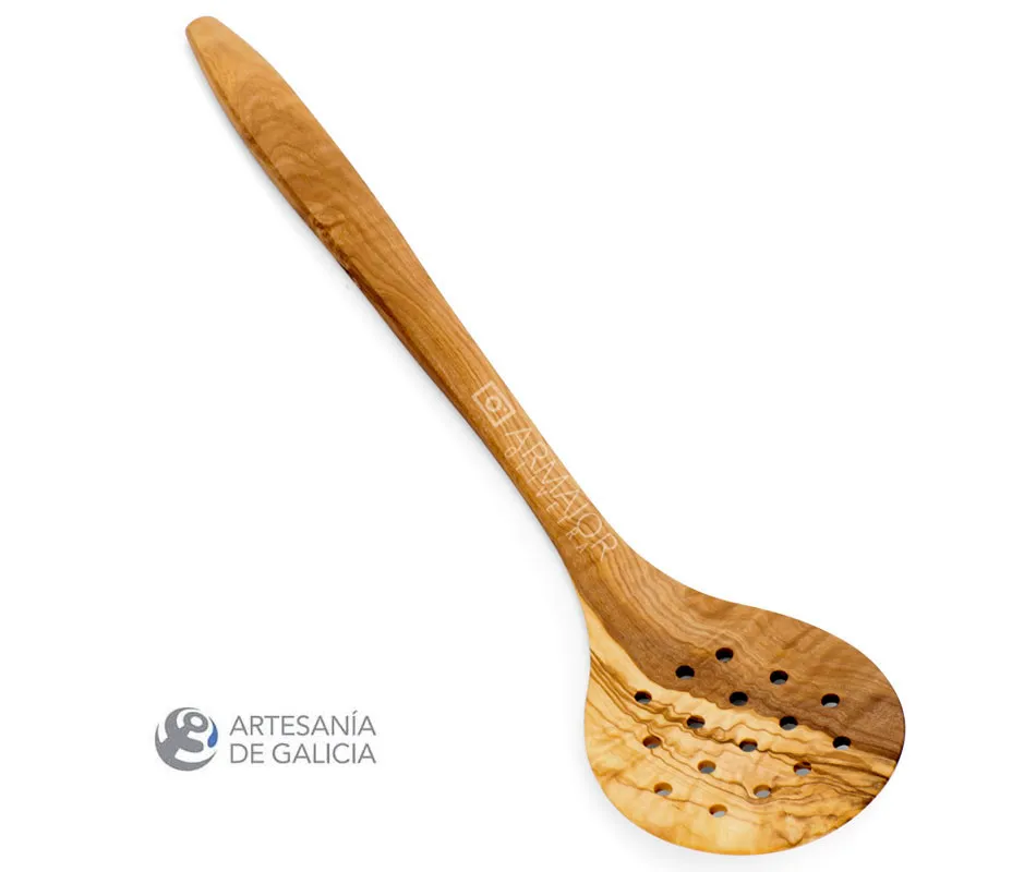 Espumadera redonda hecha a mano en madera de olivo. Su forma redonda y sus agujeros hacen este utensilio el más indicado para espumar los caldos y líquidos, extrayendo las impurezas. También se usa para sacar alimentos hervidos de la olla, dejando que el agua escurra por sus agujeros. En tamaño extralargo para evitar las salpicaduras.