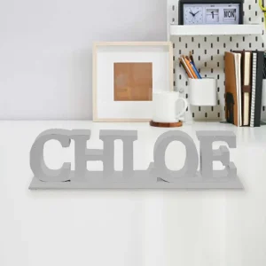 La pieza está fabricada en DM de 16mm acabado lacado satinado colores varios con nombre en contrachapado de roble.
