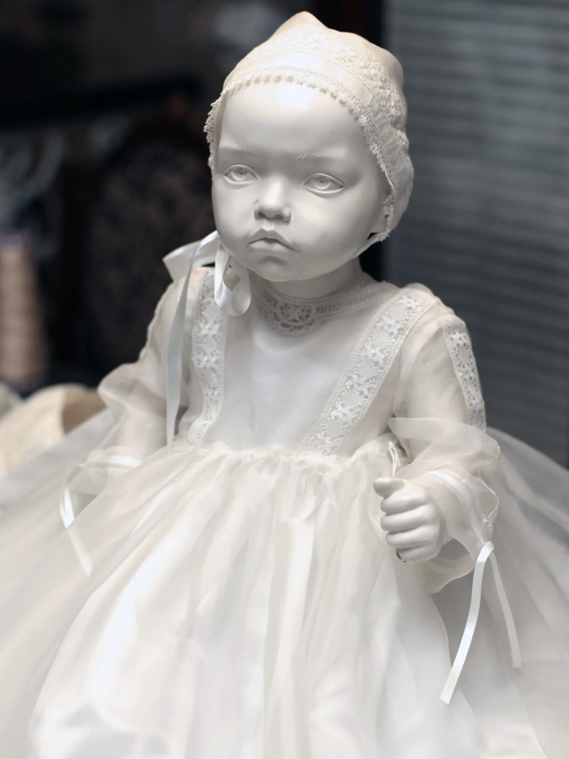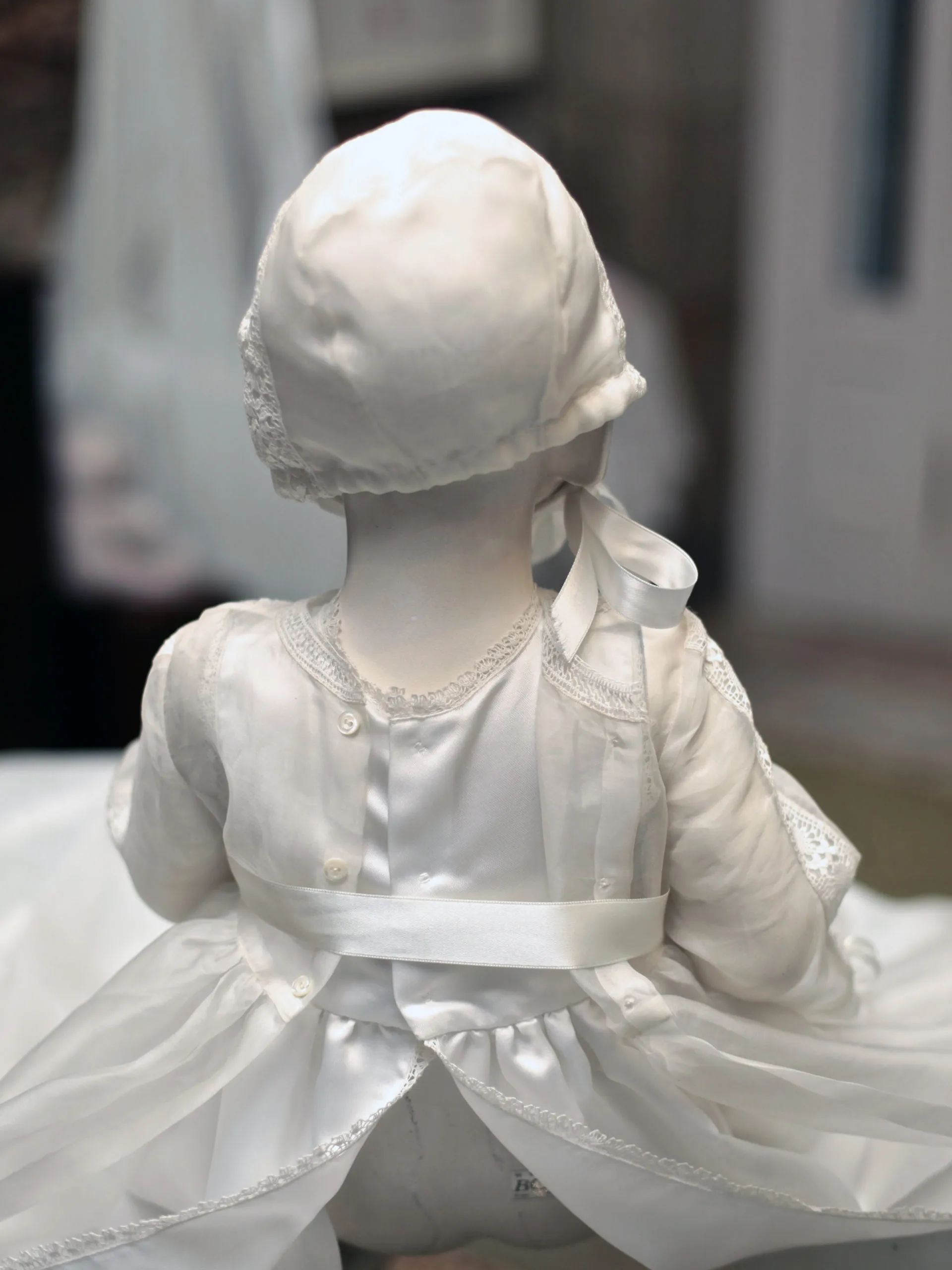 Faldón de bautizo elaborado en organza de seda natural color marfil con tres entredoses de encaje de bolillos dos crucetas . Forro de raso color marfil rematado con encaje de bolillos estrecho.