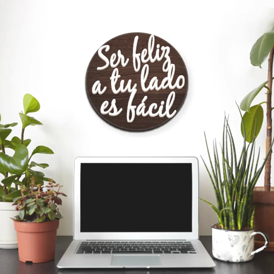 Hemos preparado esta hermosa frase para decorar vuestro hogar o para regalar a alguien especial. La base es en madera rechapada de roble con barniz oscurecido y las letras son lacadas en color blanco satinado. Puedes solicitar por correo el color que desees y transformarla en una pieza única sólo para ti.