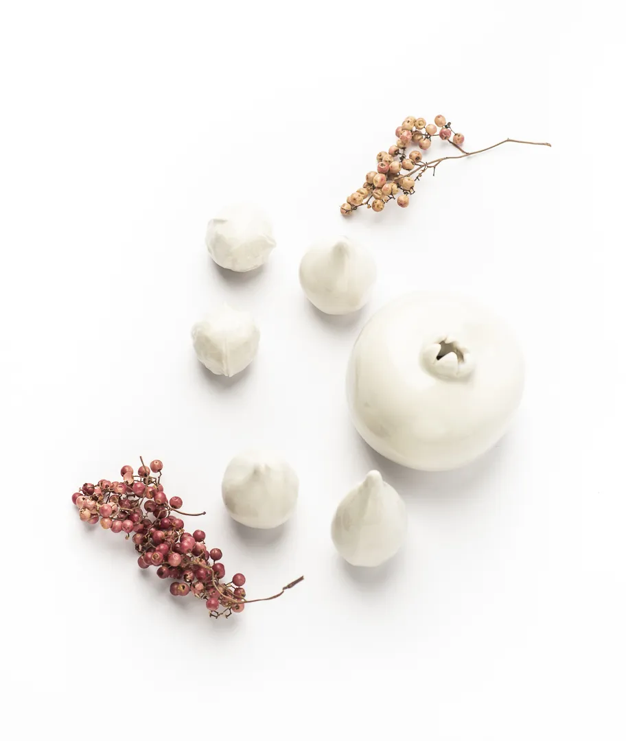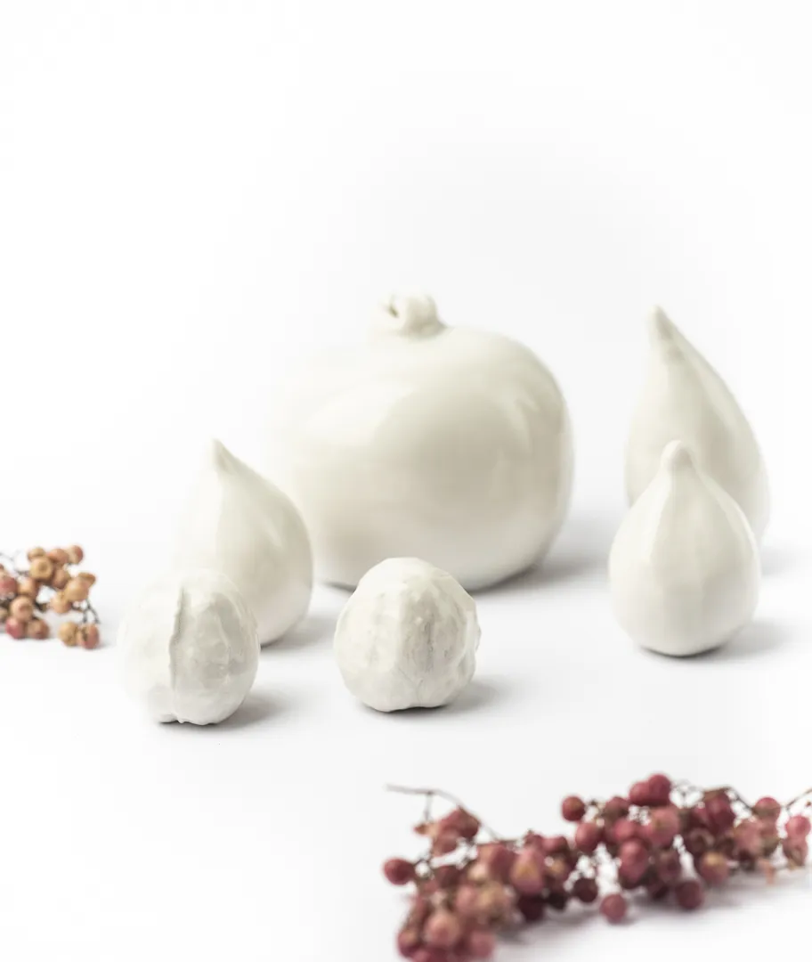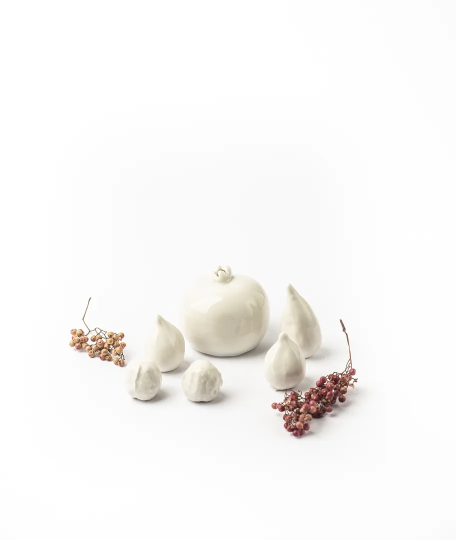 Frutas decorativas realizadas en gres. El set incluye una granada, dos nueces, dos higos y una breva.