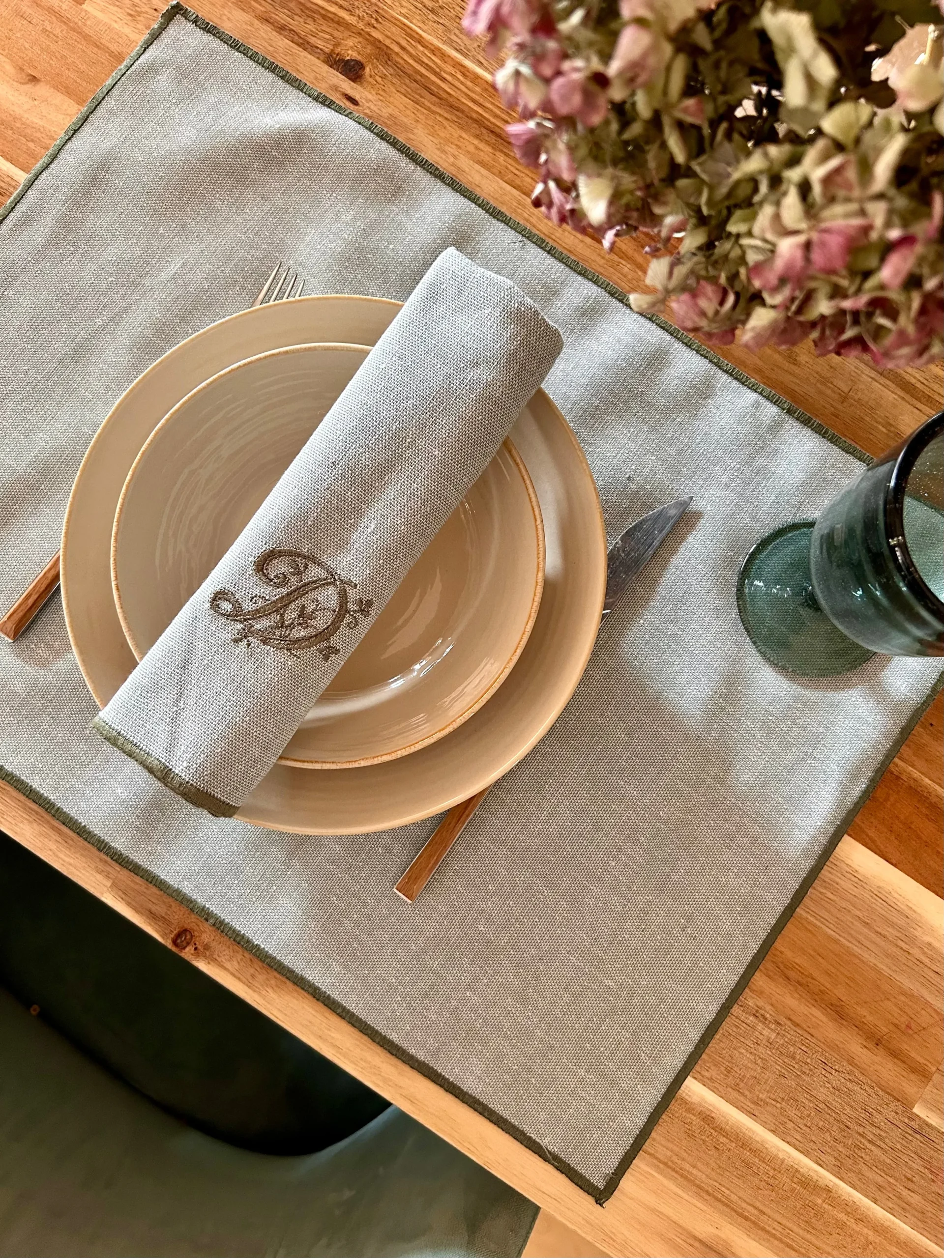 Manteles Individuales reversibles, para que puedas dar versatilidad a tu mesa. Combinan dos telas a elegir junto con el festón y el bordado.