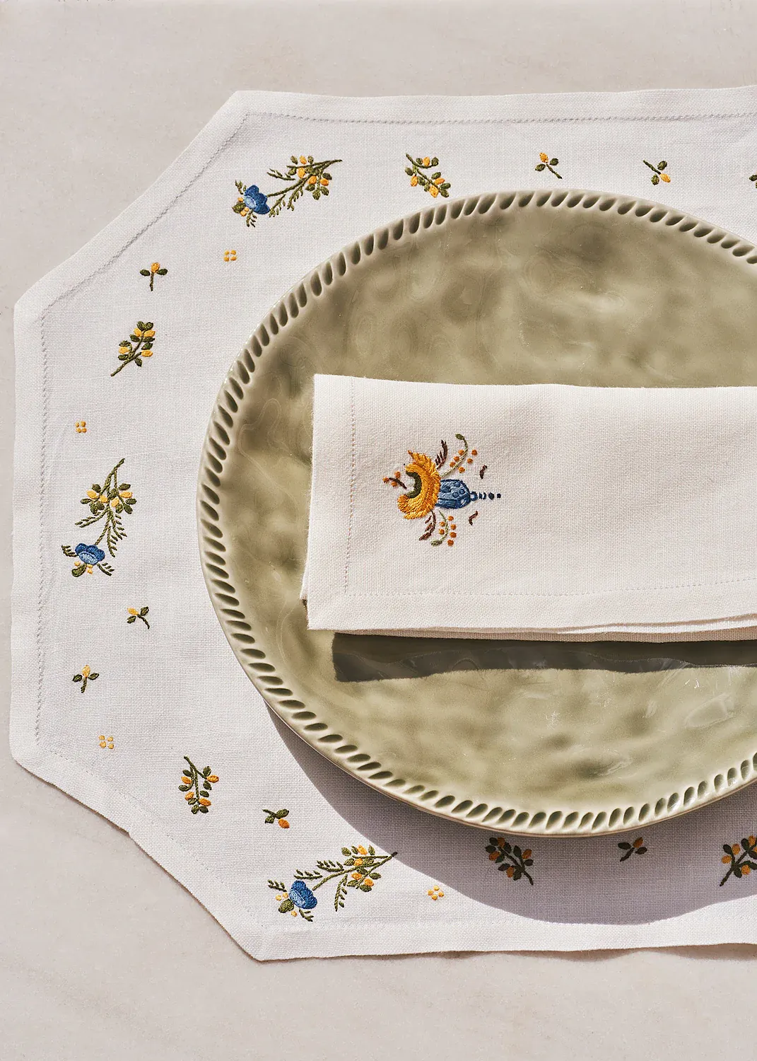 Individuales de mesa bordados a mano, utilizando la técnica del punto pasado, con dibujos inspirados en la cerámica de Talavera de la Reina de la serie Alcora “del ramito”. Realizados por bordadoras de los pueblos de Toledo (España).