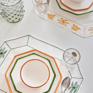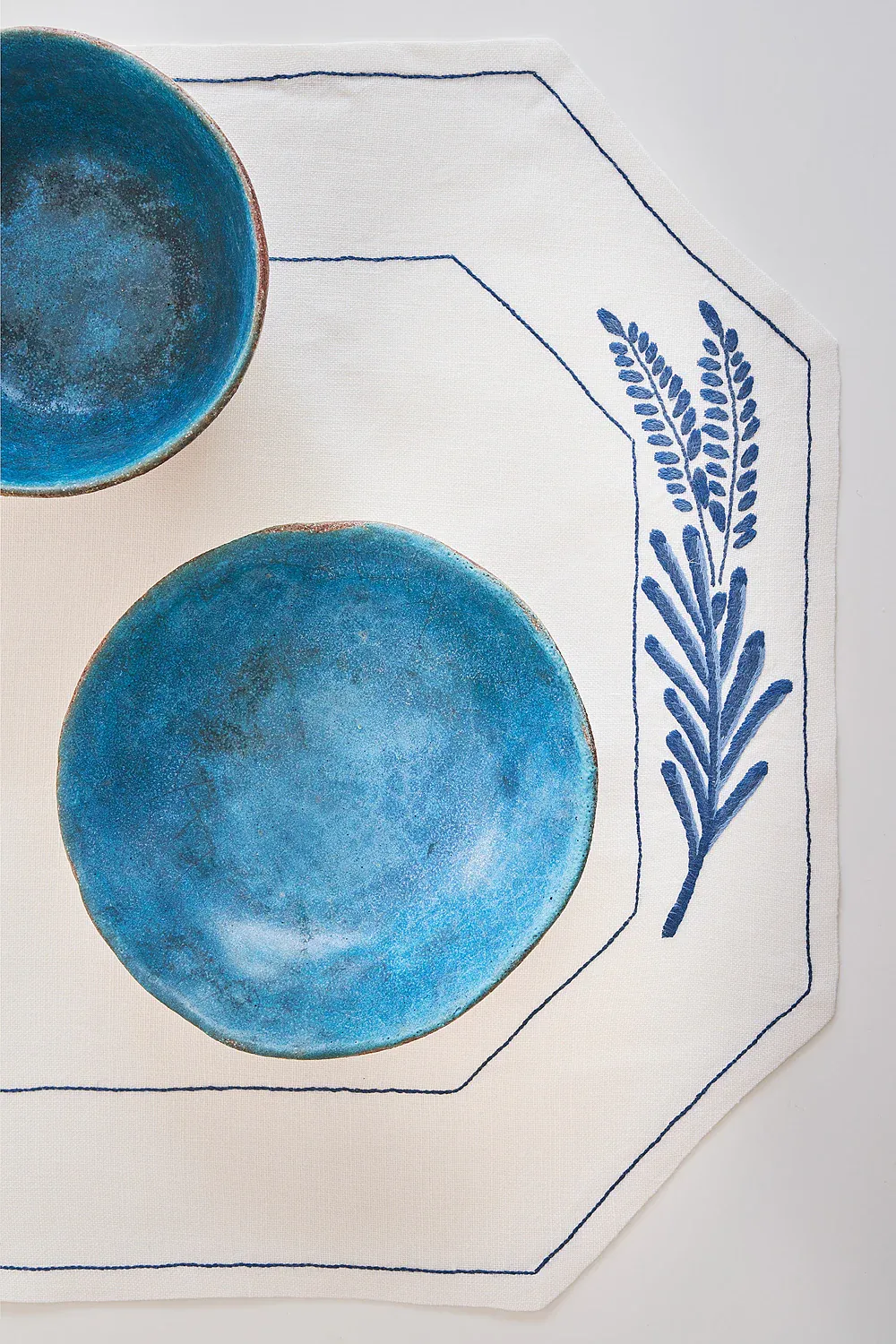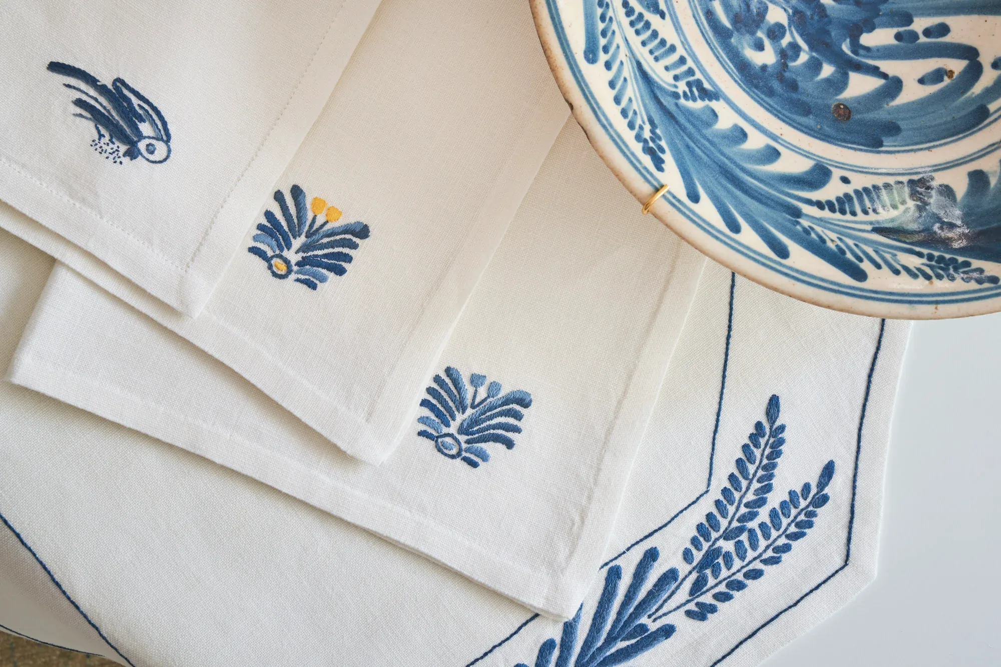 Individuales de mesa confeccionados y bordados a mano utilizando la técnica de punto a pasado e inspirados en la colección de cerámica de Talavera de la Reina de la serie de los Helechos y Golondrinas (S.XVII). Hechos por artesanas textiles de distintos pueblos de Toledo, España.