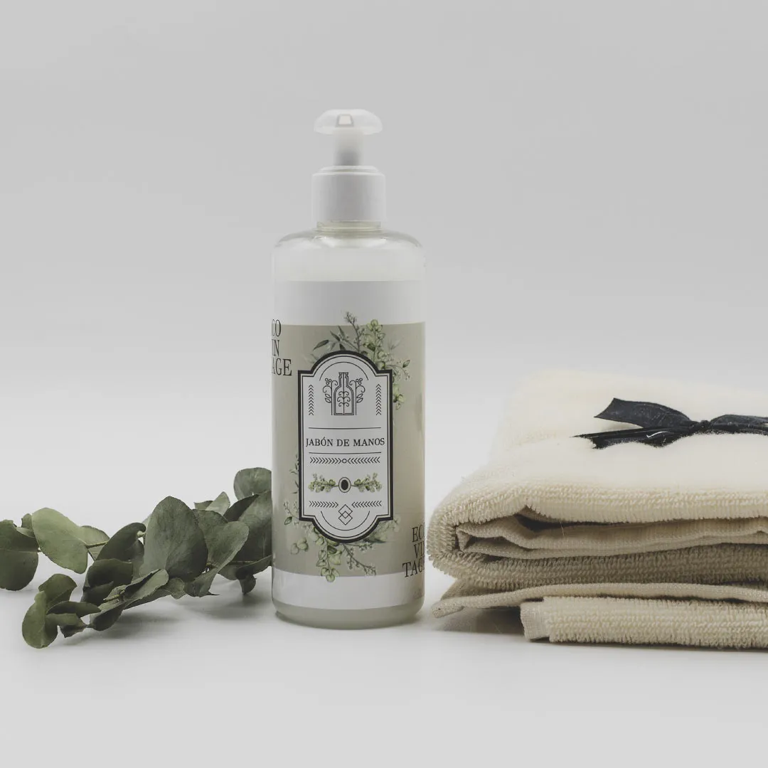 Elige tu botella de Jabón de manos de la gama Eco Vintage. Las botellas están fabricadas con materiales 100% reciclados y reciclables.