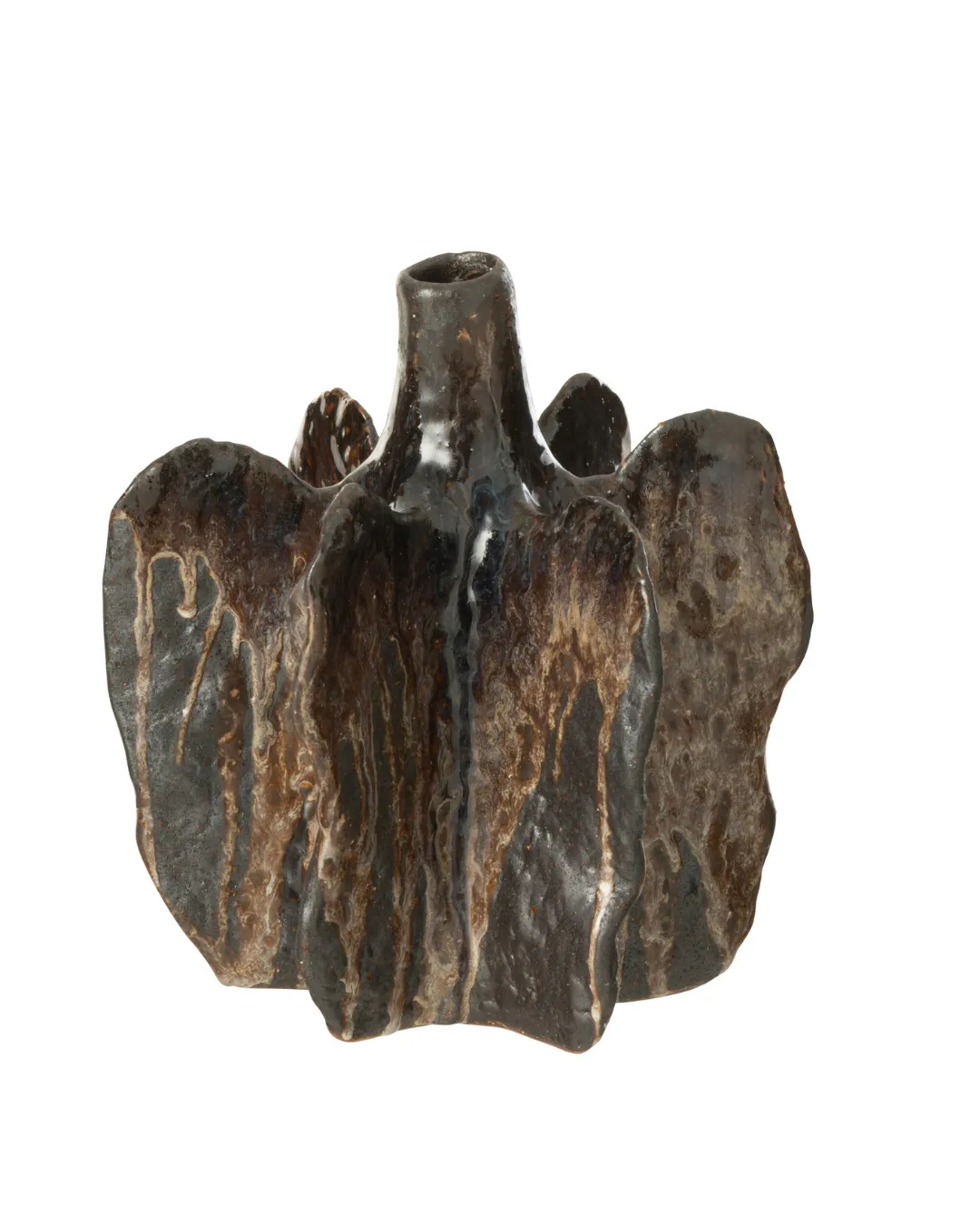 Jarrón portavelas de cerámica en color marrón y negro. Tamaño mediano. Medidas 20,5 cm. alto x 18,5 cm. ancho. Peso 1,15 kg. No es apto para exteriores. No incluye vela.