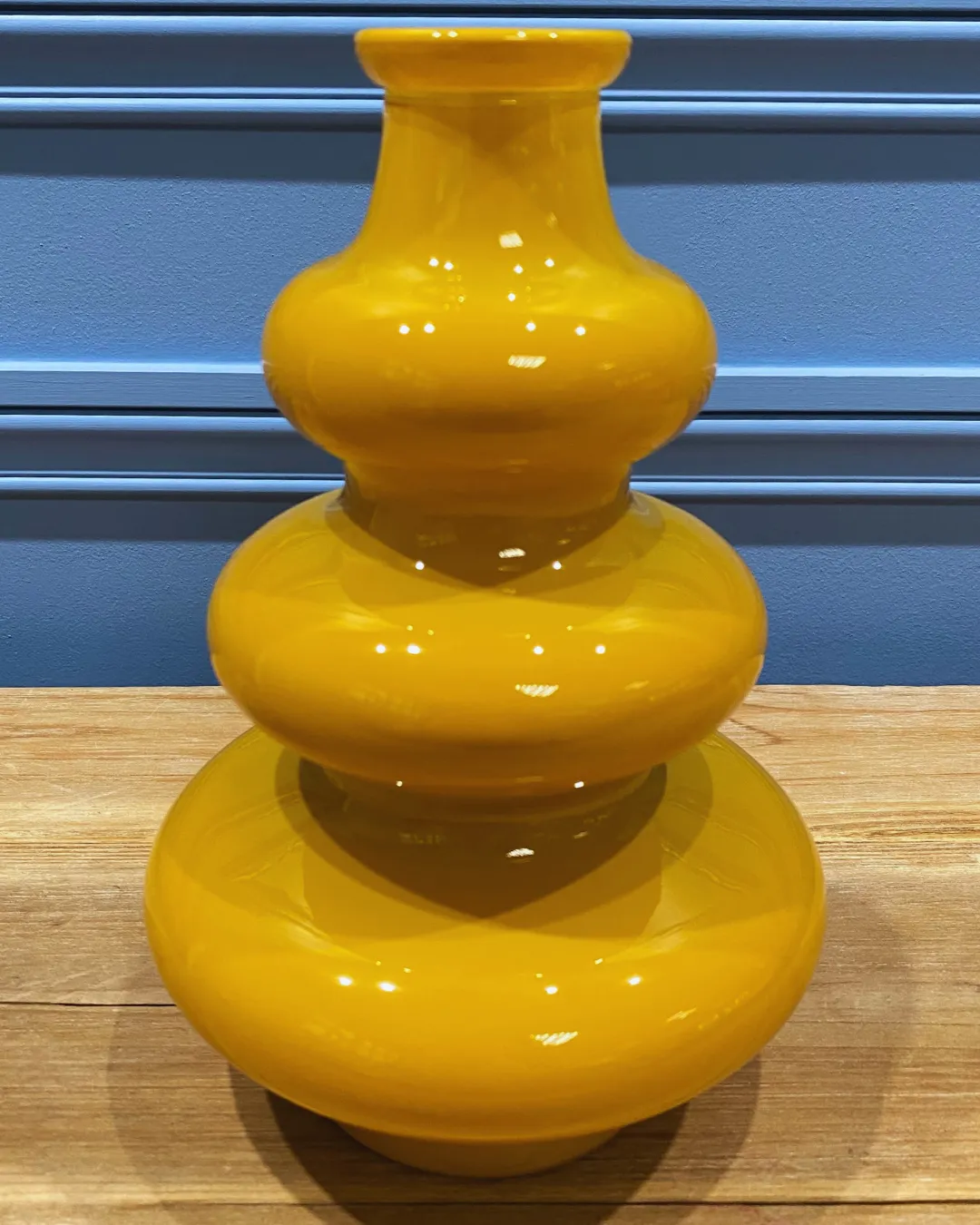Jarrón de vidrio color mostaza tamaño pequeño. Medidas 8 cm alto x 7 cm diámetro.