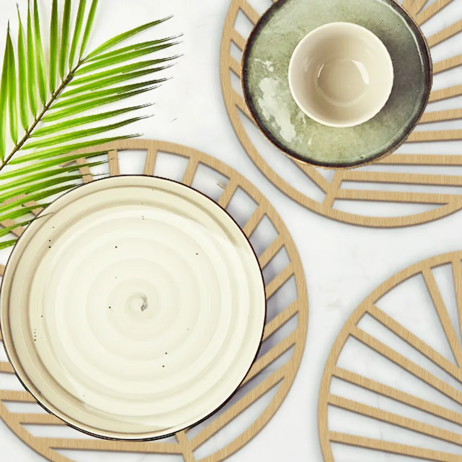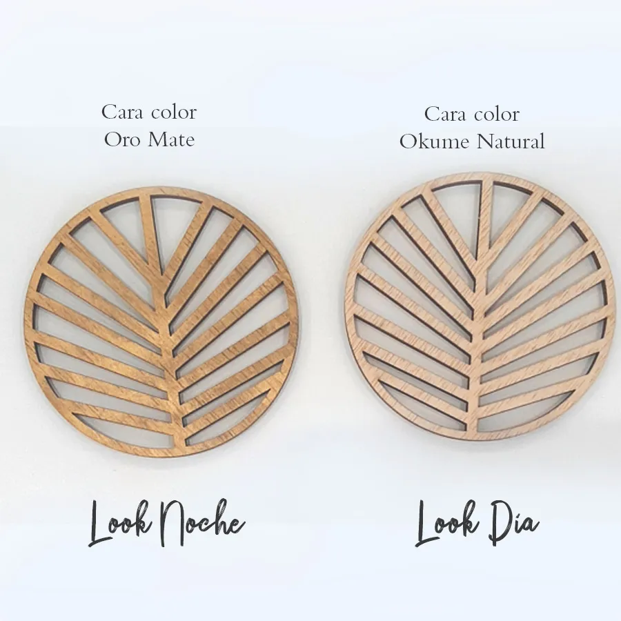 Dale un toque de diseño a tu mesa con este juego de 4 individuales redondos con un original diseño troquelado, van perfecto en una mesa redonda. La pieza está fabricada en contrachapado de okume acabado en barniz natural por una cara y la otra está pintada en color oro mate, así podrás utilizarlos de las dos maneras y crear looks diferentes a tu mesa.
