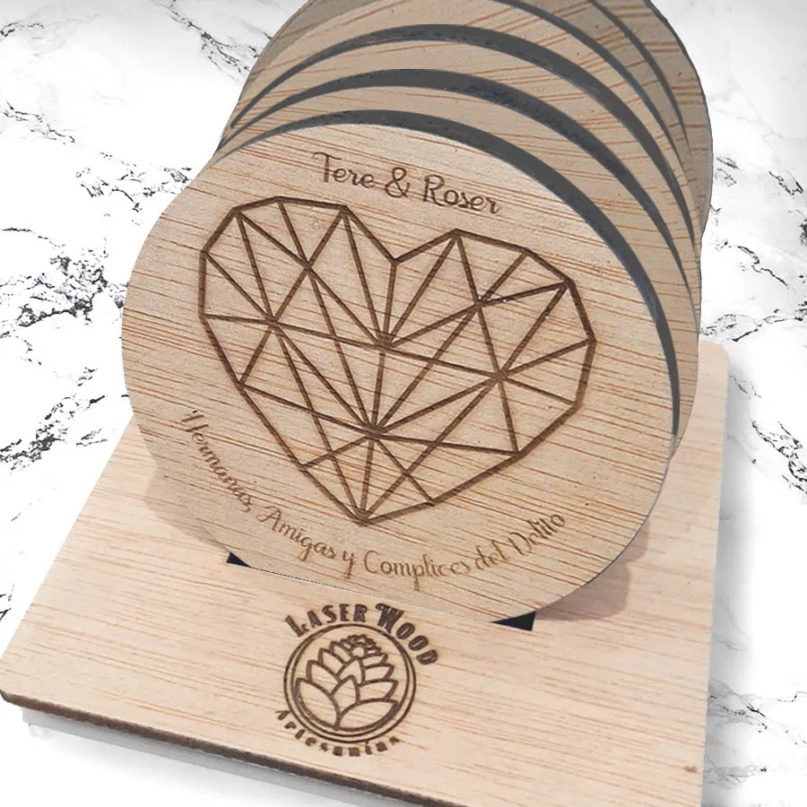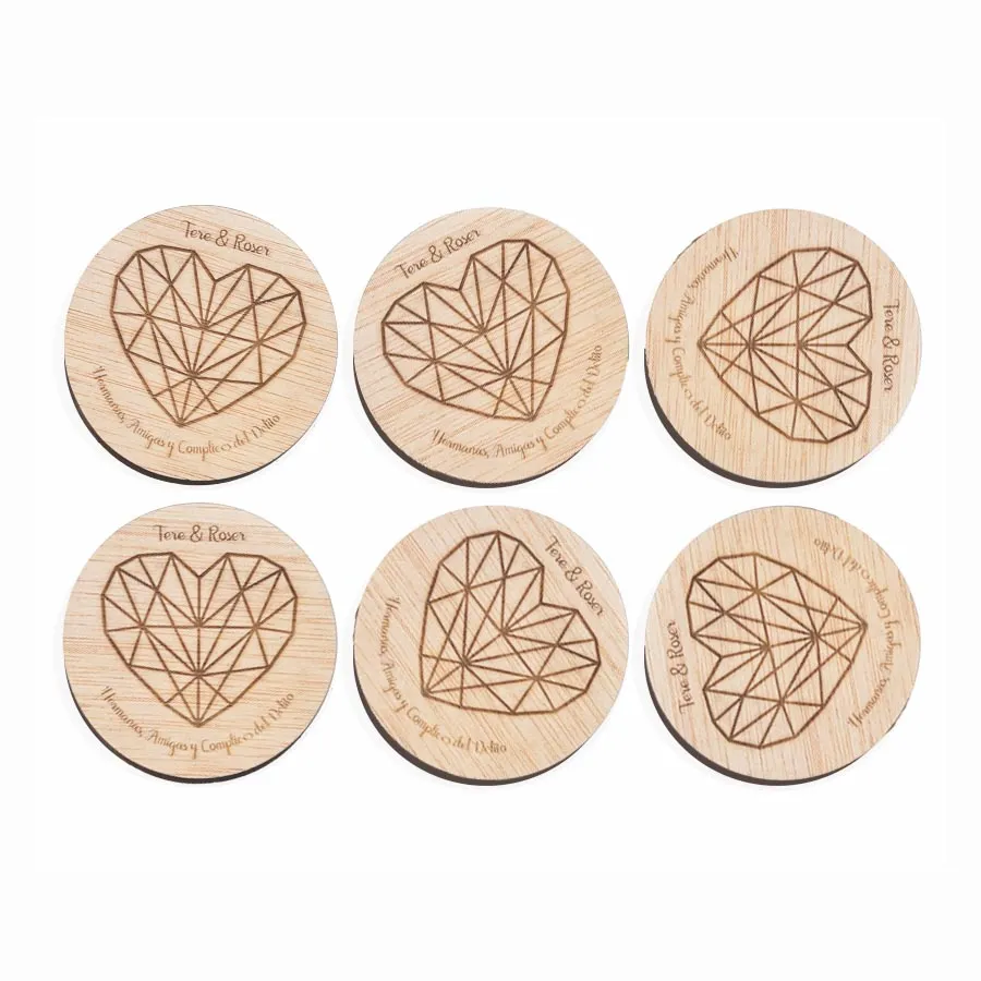 Dale un toque de diseño a tu mesa y a su vez protégela de las incómodas manchas de los vasos y copas con este juego de 6 posavasos cuadrados grabados. La pieza está fabricada en madera barnizada. Puedes solicitar por correo el color que desees, grabar un texto y así transformarla en una pieza única sólo para ti.