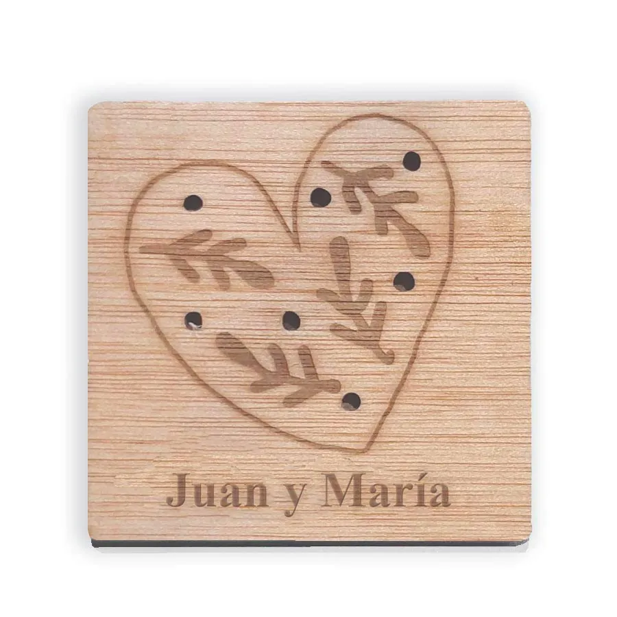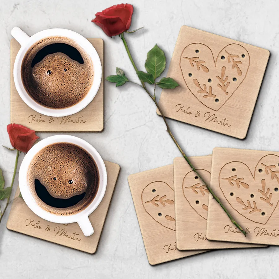 Dale un toque de diseño a tu mesa y a su vez protégela de las incómodas manchas de los vasos y copas con este juego de 6 posavasos cuadrados grabados. La pieza está fabricada en madera barnizada. Puedes solicitar por correo el color que desees, grabar un texto y así transformarla en una pieza única sólo para ti.