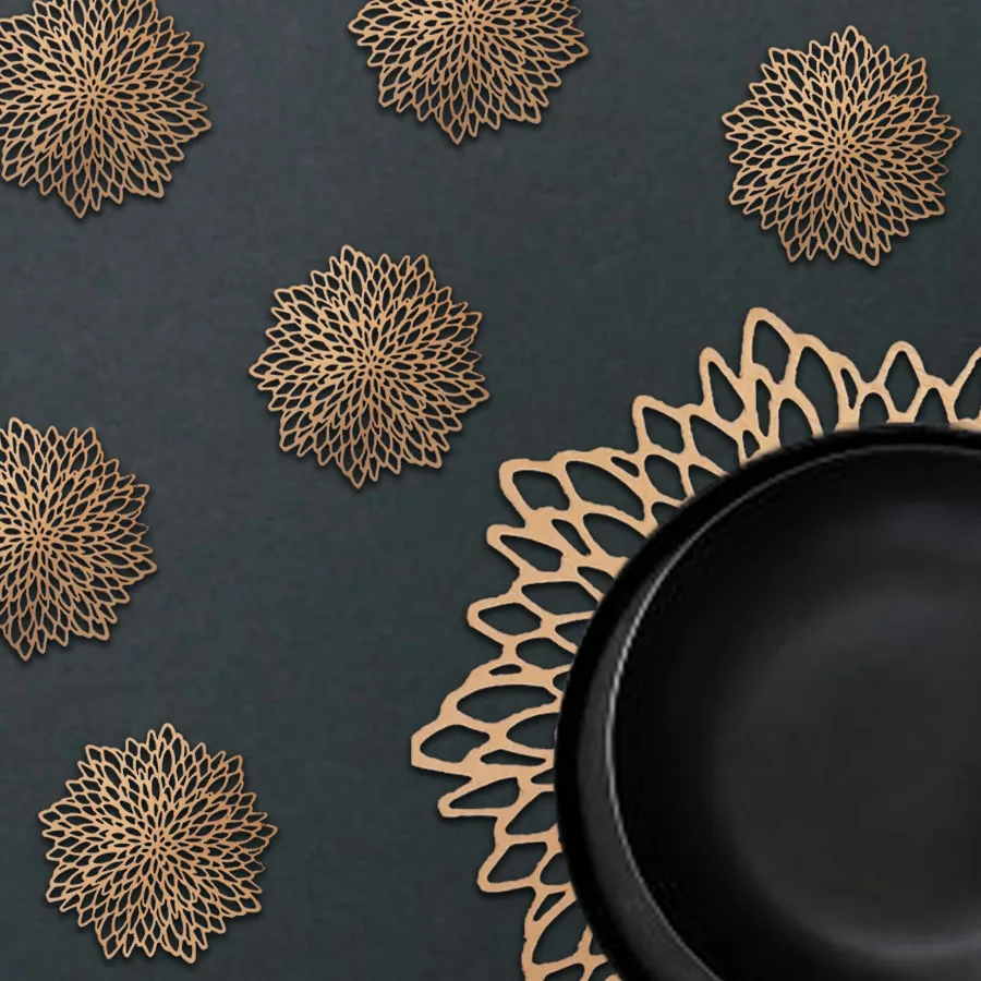 Dale un toque de glamour y diseño a tu mesa con este juego de posavasos en color oro y a su vez protégela de las incómodas manchas de los vasos y copas. La pieza está fabricada en madera pintada y vienen con una base de madera.