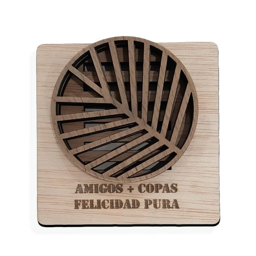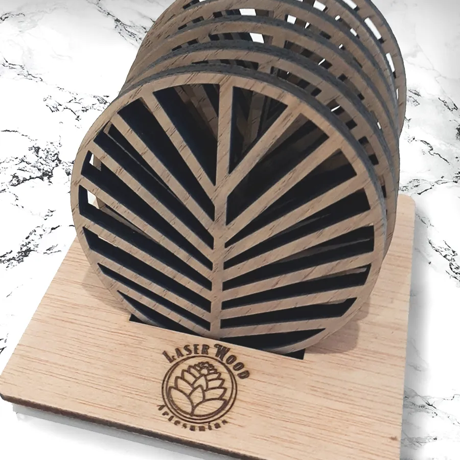 Dale un toque de diseño a tu mesa y a su vez protégela de las incómodas manchas de los vasos y copas con este juego de 6 posavasos redondos con un original diseño troquelado. La pieza está fabricada en contrachapado de roble acabado en barniz natural, los cantos son negros. Puedes solicitar por correo el color que desees y así transformarla  en una pieza única sólo para ti.