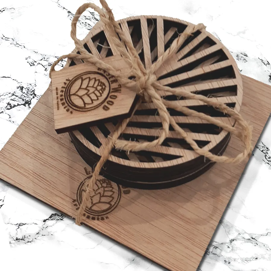 Juego de 6 posavasos fabricados en contrachapado de roble acabado en barniz natural.