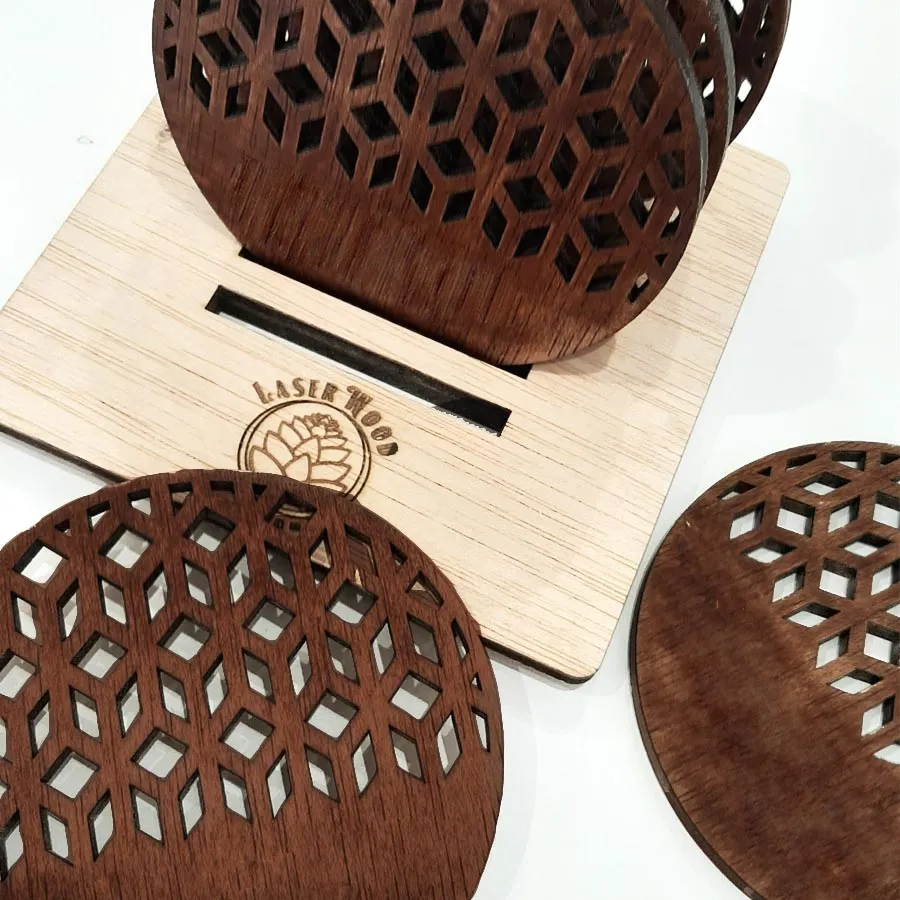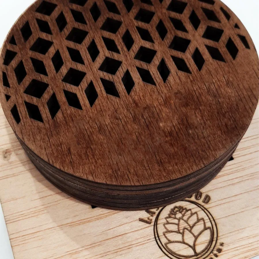 Dale un toque de diseño a tu mesa y a su vez protégela de las incómodas manchas de los vasos y copas con este juego de 6 posavasos redondos con un original diseño troquelado. La pieza está fabricada en contrachapado de roble acabado en barniz oscurecido, los cantos son negros. Puedes solicitar por correo el color que desees, grabar un texto y así transformarla en una pieza única sólo para ti.