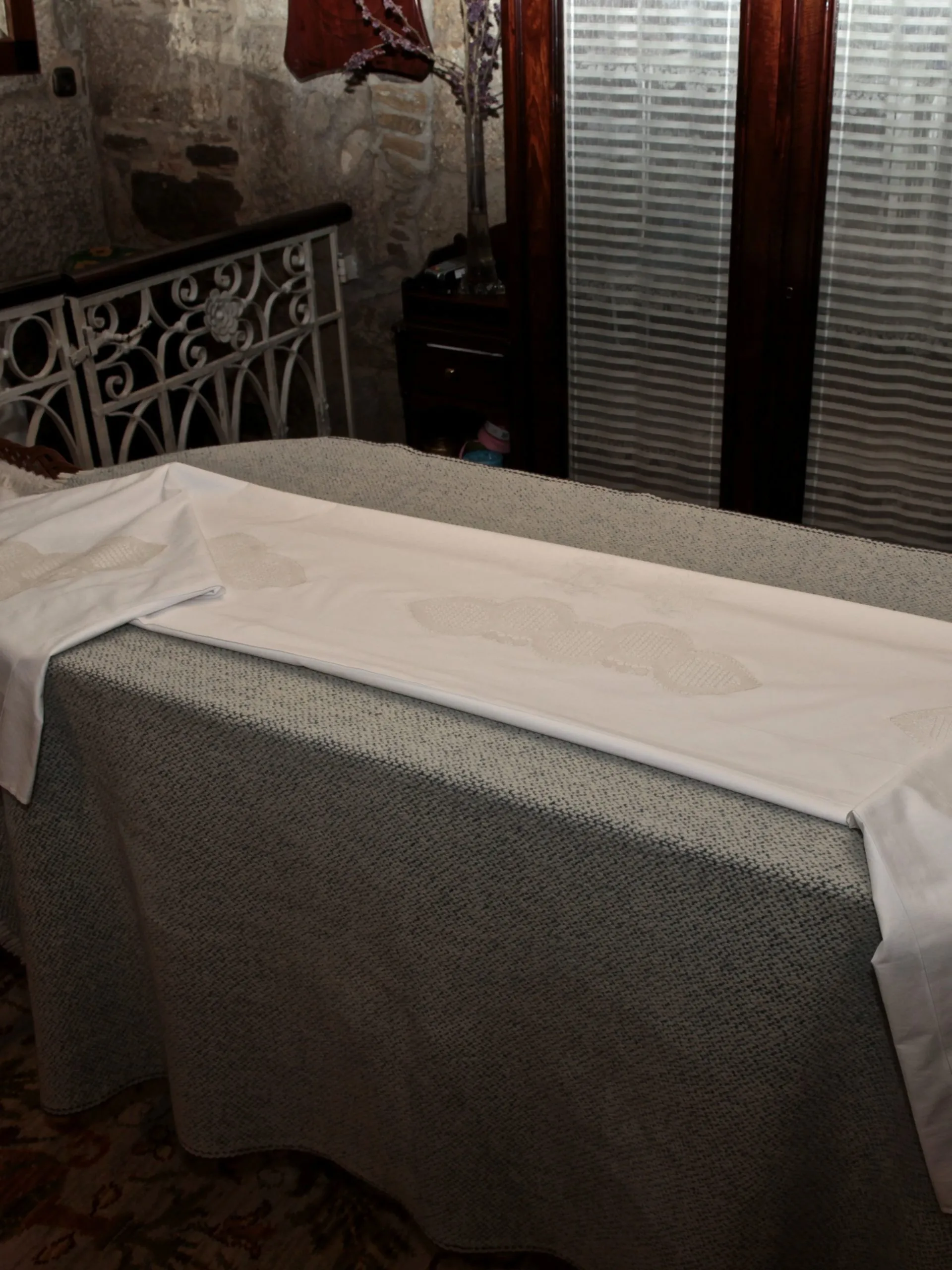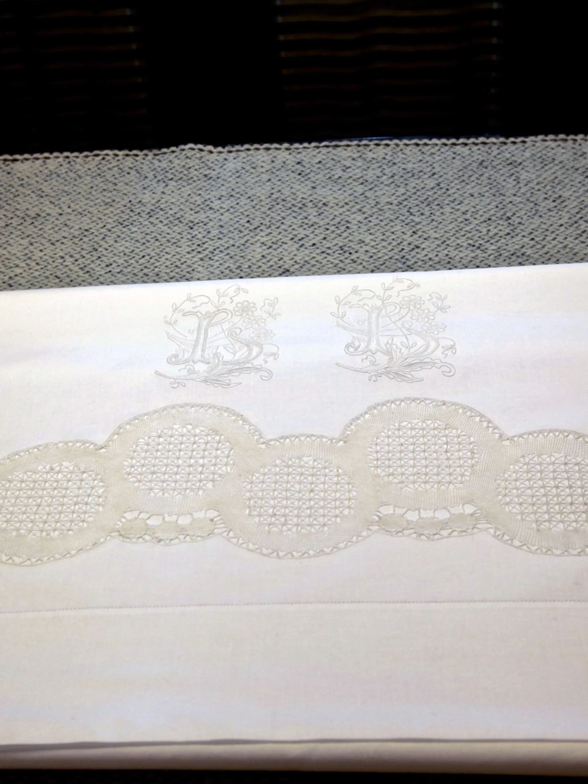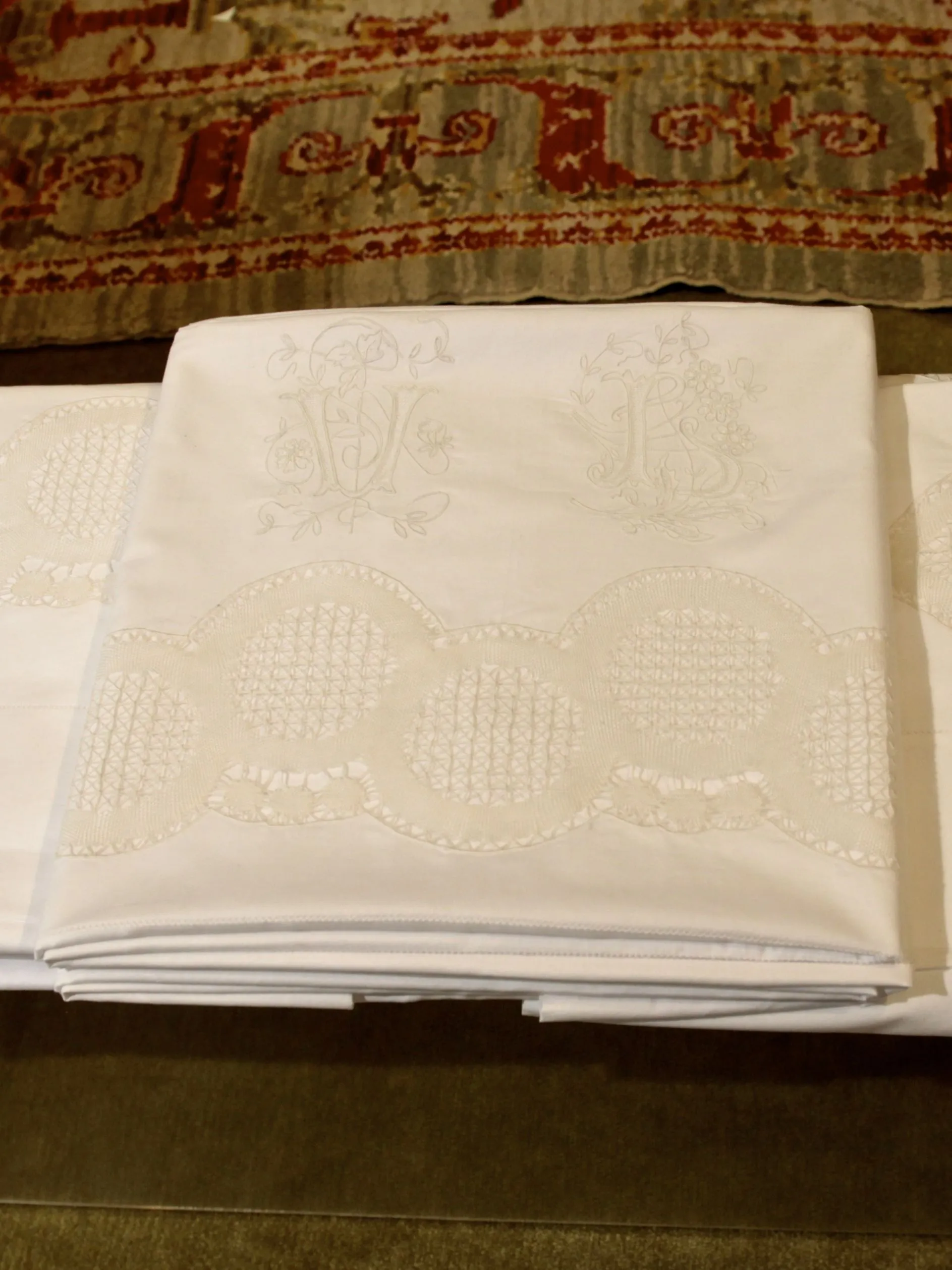 Delicado juego de cama elaborado a mano en batista de algodón con vainicas y 5 aplicaciones de encaje de bolillos