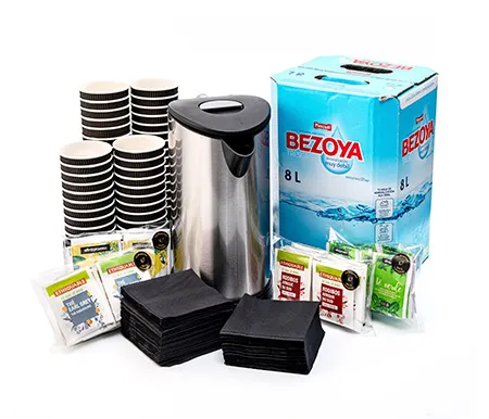 Prepara tu evento con nuestro set completo: incluye un kettle, una garrafa de 8L de agua, 20 sobres de té verde de menta, 20 de manzanilla, 20 de Earl Grey, 20 de té rooibos, 100 vasos y 100 servilletas.