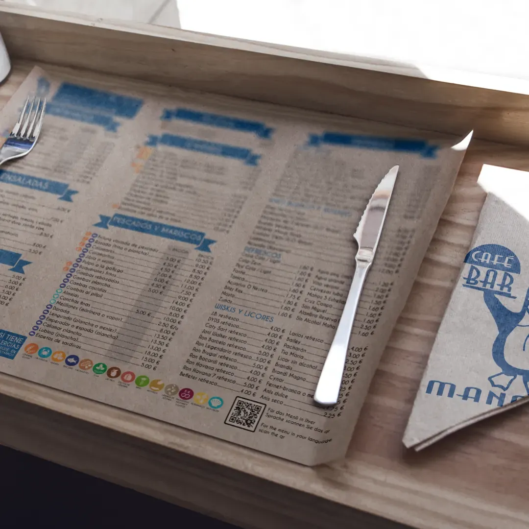 Manteles de papel personalizados individuales. Ideal para colocar en mesas y bandejas de hostelería. Permite anunciar los platos del menú y las especialidades de la casa o lo que desee.