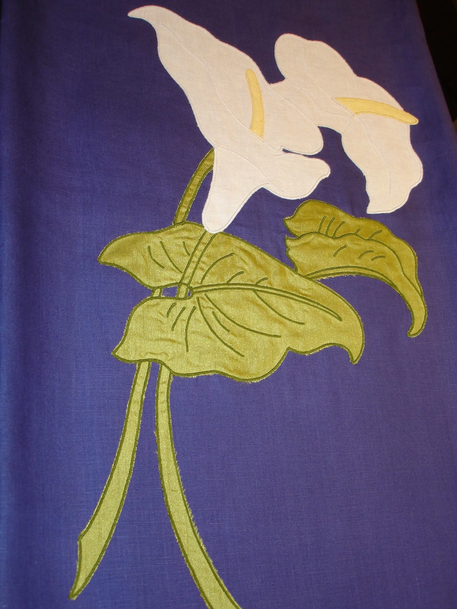 Pieza única realizada en lino color cobalto con un bastillón rematado a mano con vainica. En el centro hemos bordado un motivo de calas con sobrepuesto de distintos tejidos.