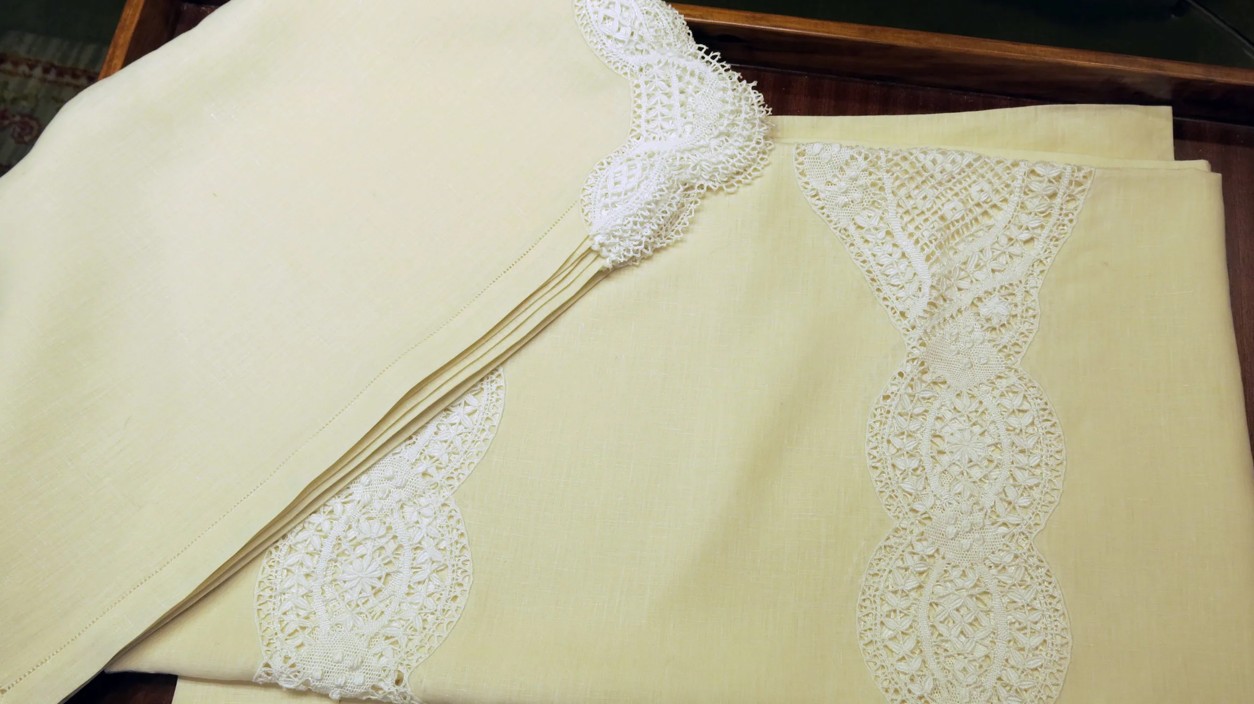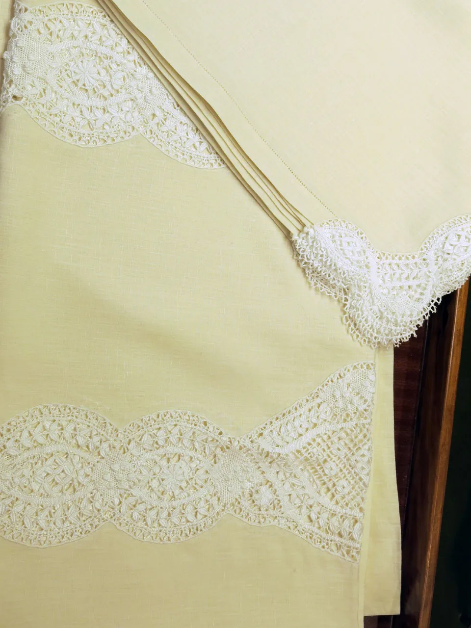 Mantelería de lino bordada a mano con camino de encaje de bolillos