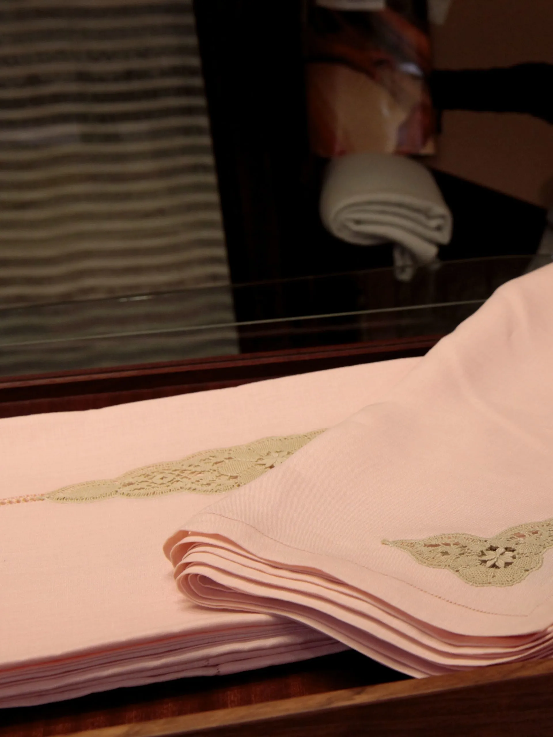 Mantelería de lino rosa bordada a mano con vainicas, calados y aplicaciones