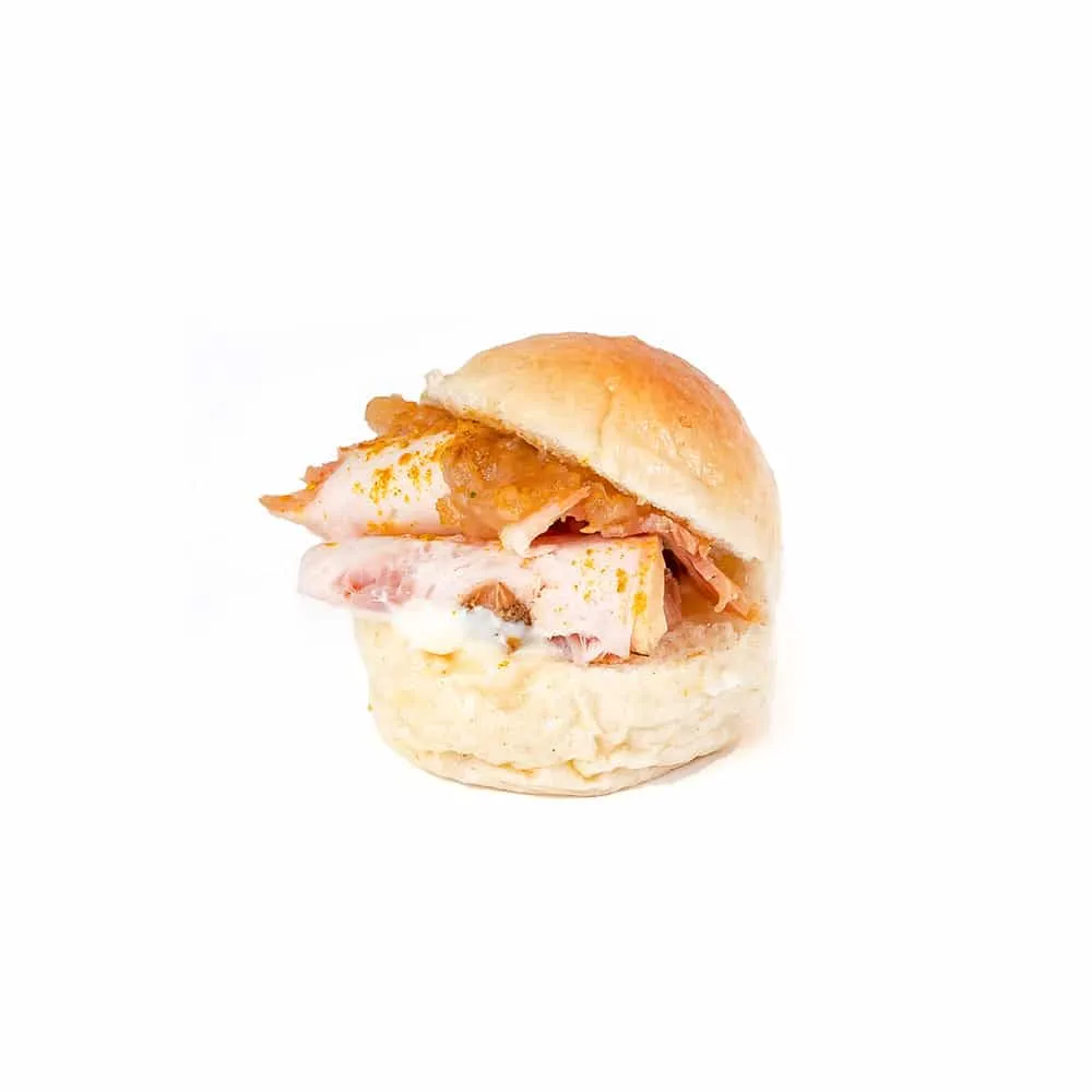 Disfruta de nuestra exquisita media noche rellena de un insuperable pollo braseado al curry con cebolla caramelizada.