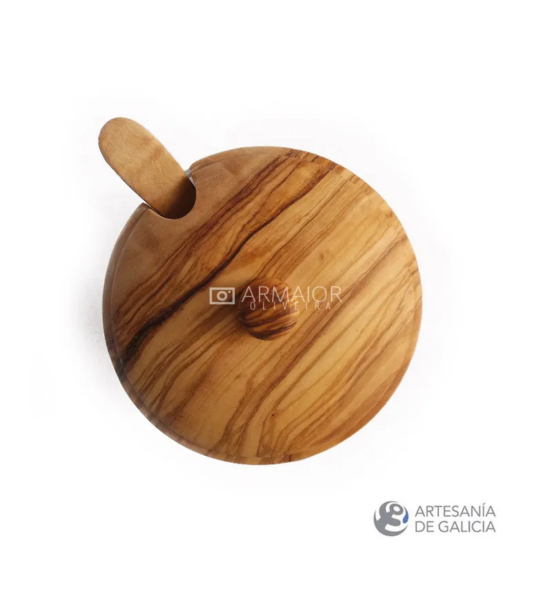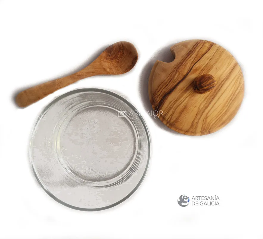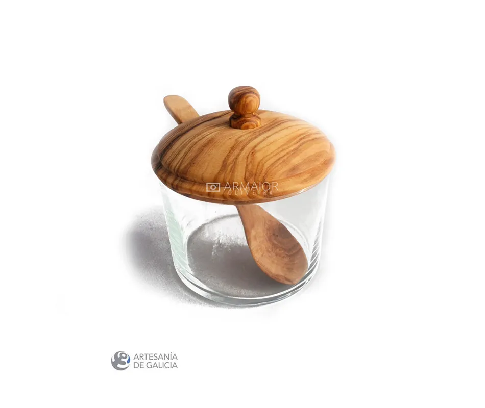 Mermeladera hecha a mano en cristal y madera de olivo. Para guardar y servir la mermelada. Tu mesa lucirá muy hermosa con este recipiente en cristal. Fácil de limpiar para cuando quieras cambiar el sabor de tu confitura con una cucharita para verter el dulce sobre el pan o la bollería y con una tapa para resguardar y proteger su contenido. Con todas las características que hacen de la madera de olivo una de las más recomendadas para usar en la cocina: