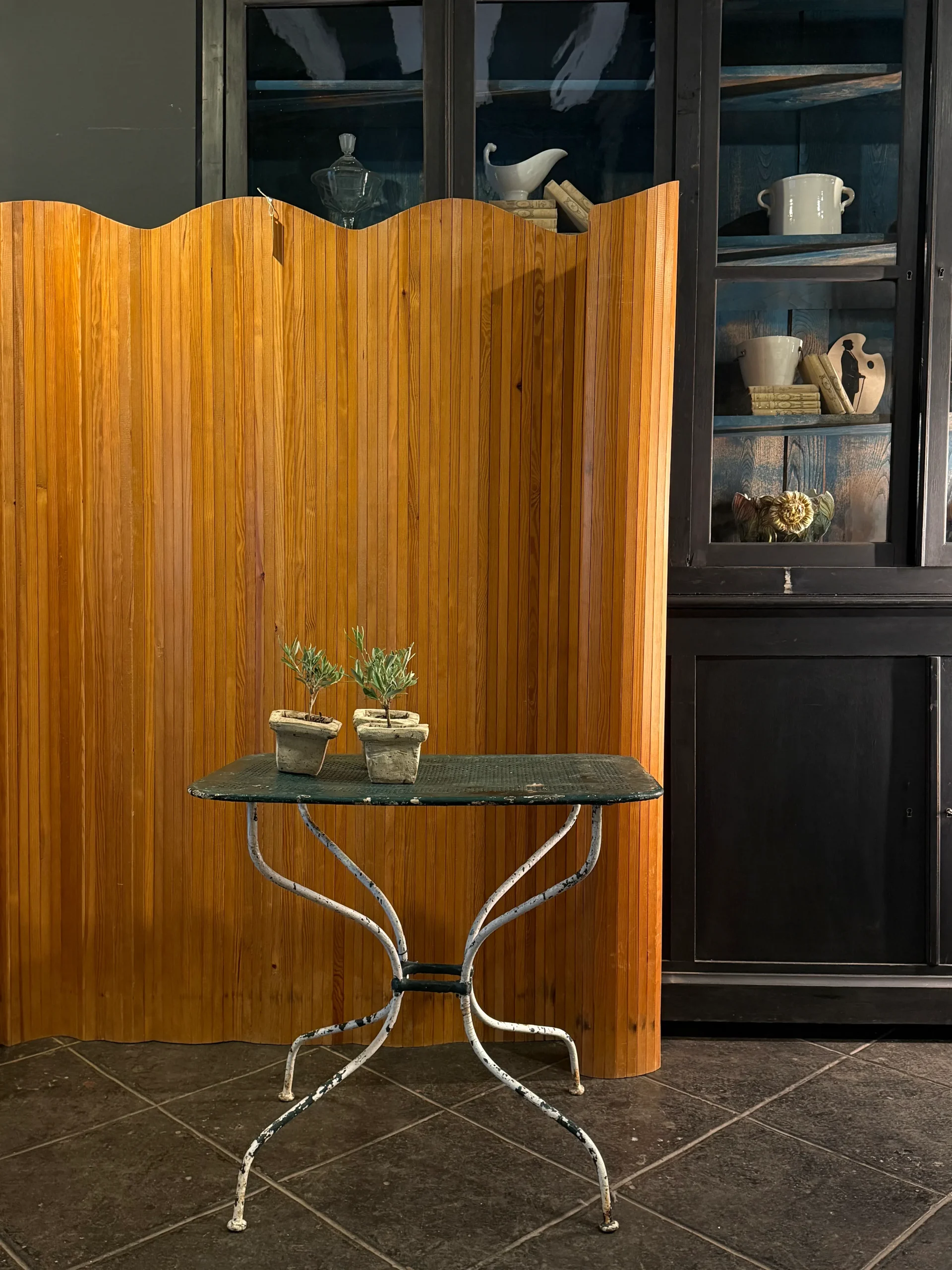 Esta mesa de hierro calada, con su elegante pata «París» y su pátina original en tonos verde y blanco, es una pieza con alma. Su tamaño contenido y su estructura ligera la convierten en una opción versátil para sumar carácter a cualquier rincón del hogar.