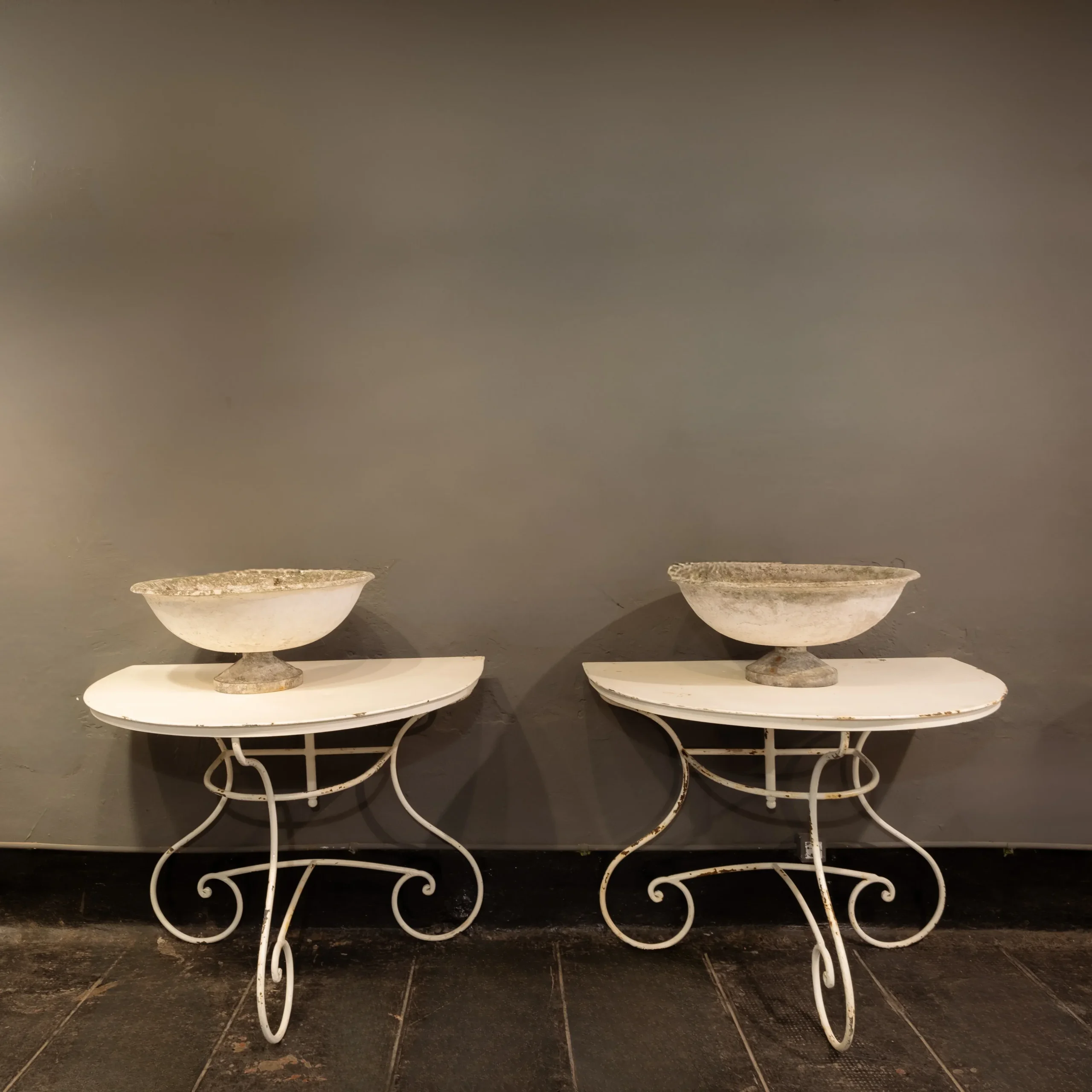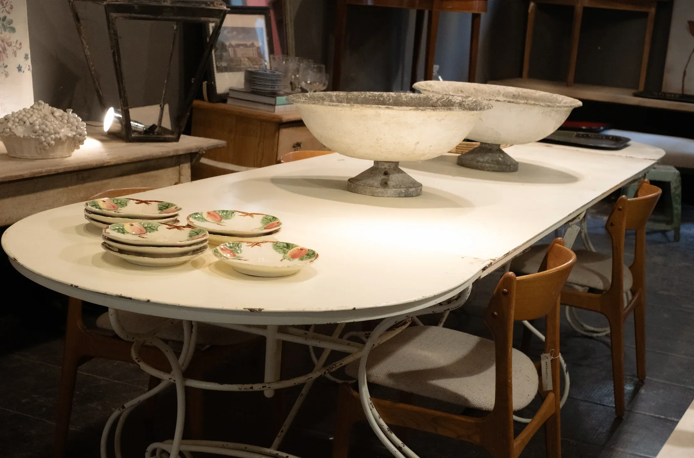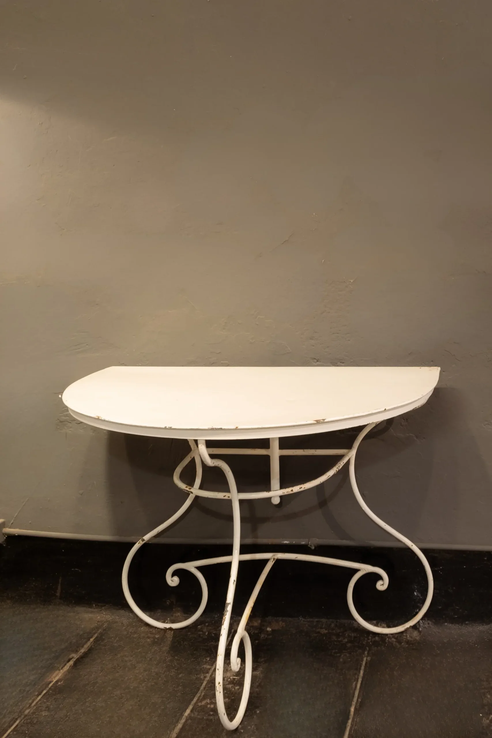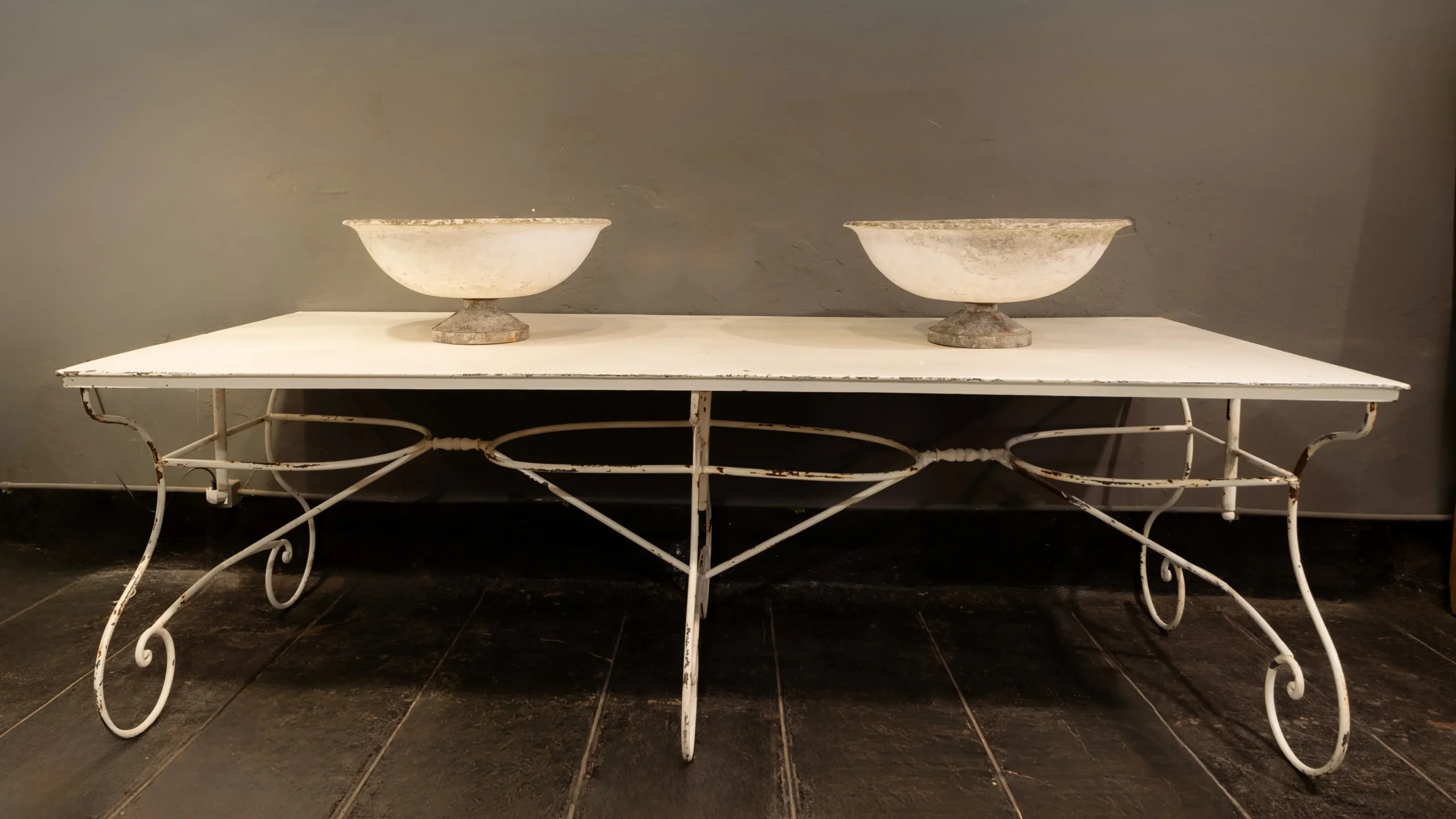 Una mesa absolutamente especial. Esta mesa italiana de hierro con pátina blanca no solo destaca por su elegante estructura y su aire clásico, sino también por su versatilidad: