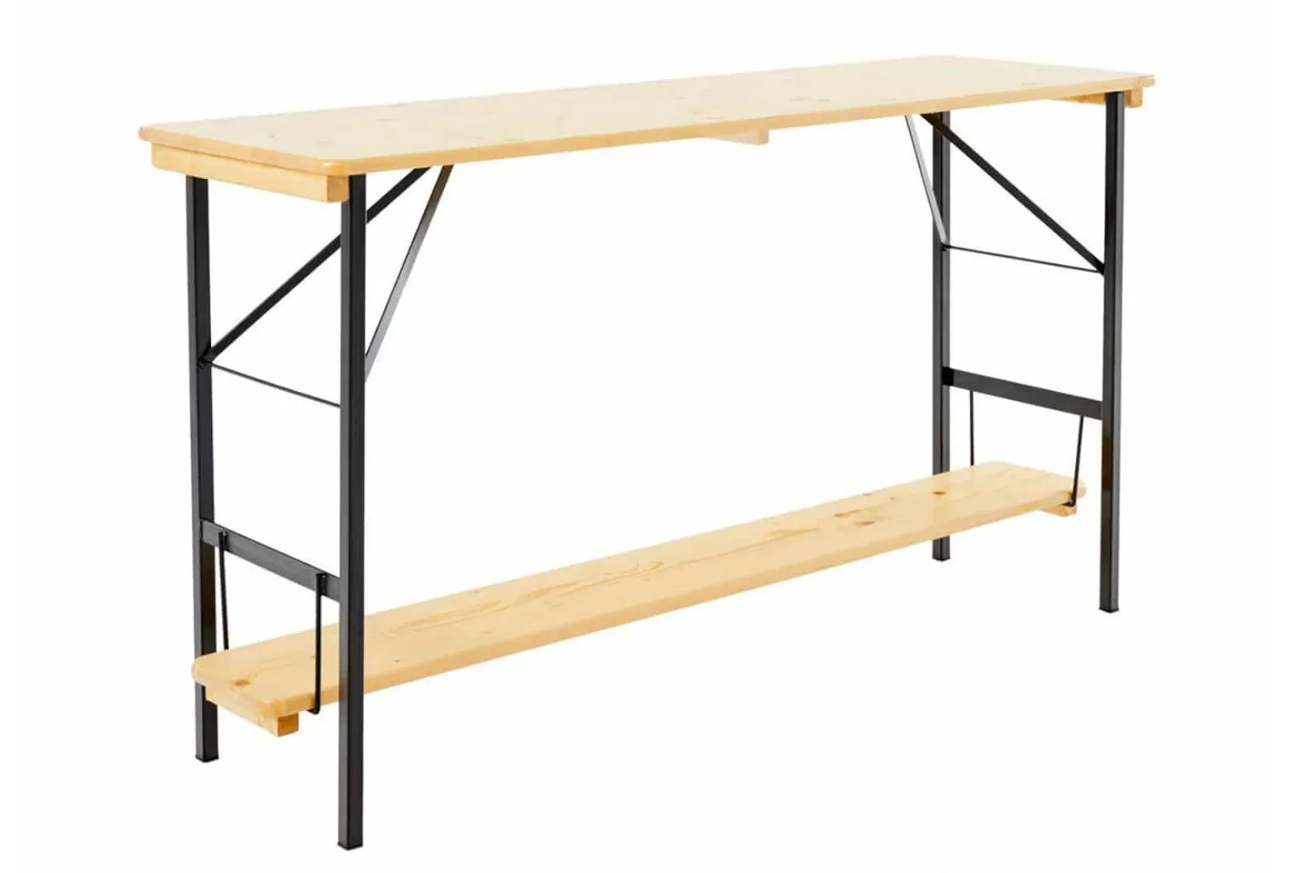 La mesa alta “200×60” se puede utilizar como mostrador móvil. El estable tablero de la mesa de dos metros de largo está hecho de madera de abeto y la sólida estructura con patas de tubos cuadrados pintada a polvo color negro que le dan al mostrador plegable una excelente estabilidad. La mesa con altura de 1,10 metros es ideal para servir bebidas y aperitivos. Los pies están equipados con tapones de plástico antideslizantes. Peso,. 32Kg.