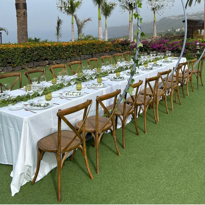 Mesa plegable rectangular de 200 x 90 cm de longitud para 6 comensales y 18Kg. Mesa indicada para banquetes donde las mesas se disponen en composición «imperial». Esta mayor profundidad (91 cm) permite decoraciones y vajillas de mayor formato.