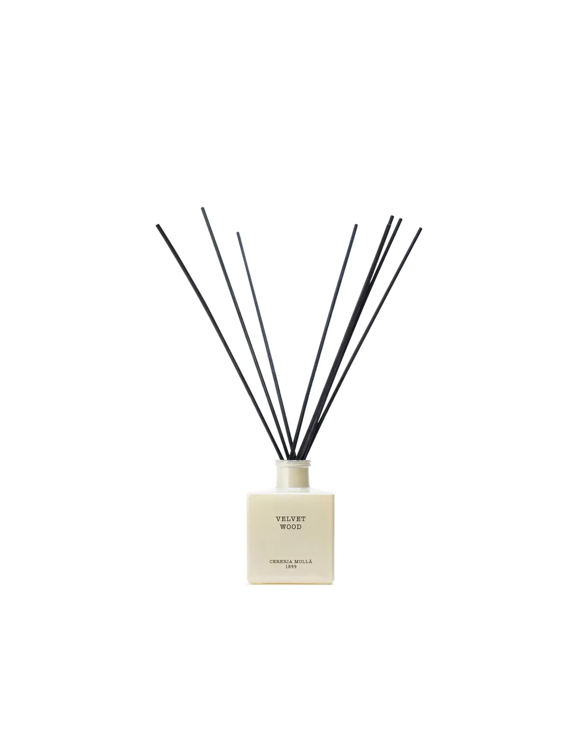 Mikado Velvet Wood, en recipiente de vidrio en color crema con una duración de 4-6 semanas.