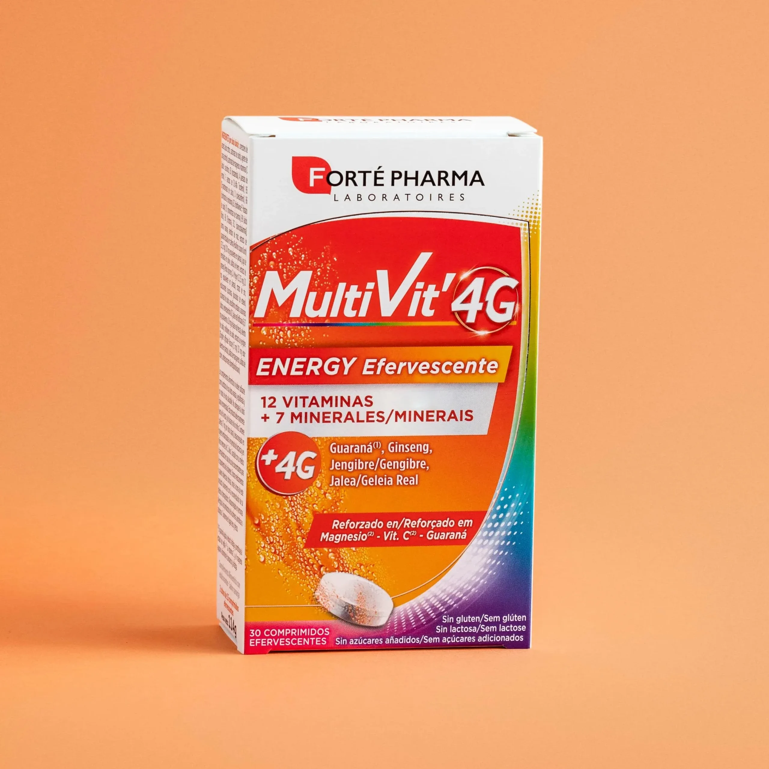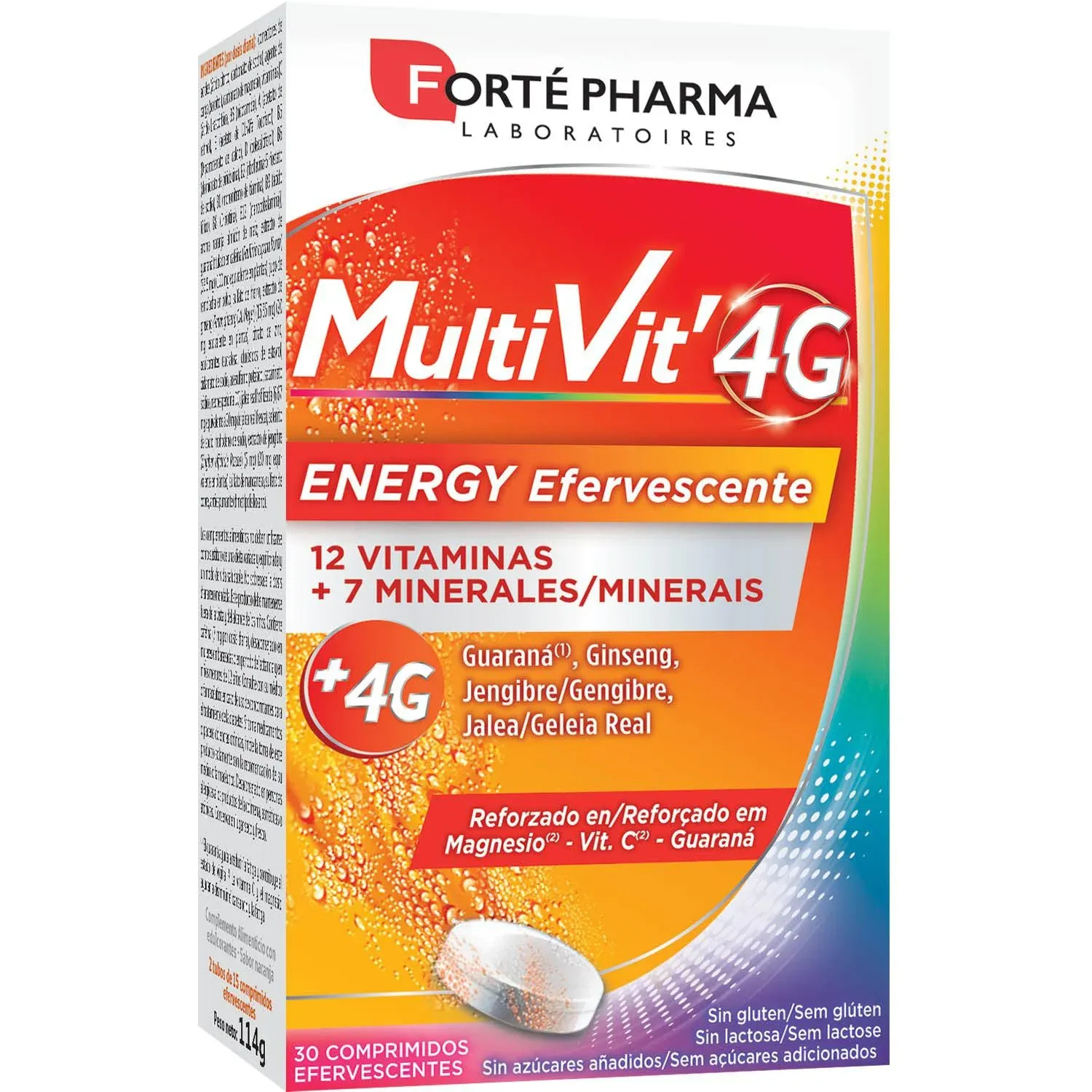 Multivit 4G ENERGY EFERVESCENTES aporta 12 vitaminas y 7 minerales junto con el complejo 4G: ginseng, guaraná, jengibre y jalea real. Reforzado en Magnesio, Vit. C y Guaraná.
