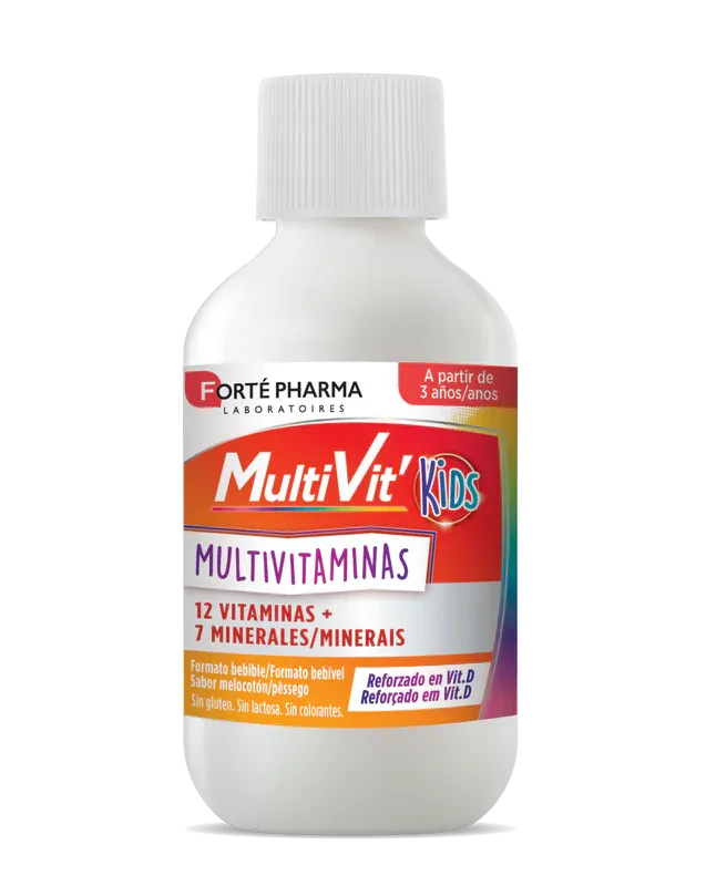 MultiVit’ Kids Bebible asocia 12 vitaminas y 7 minerales y está reforzado en vitamina D para niños a partir de 3 años.