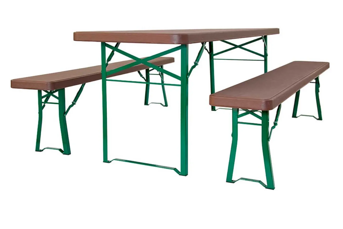 Mesa cervecera plegable de 220 x 70 cm. 220X30 en los bancos. 22Kg por juego. Patas con patín que evitan que la mesa se hunda en suelos blandos (césped, arena…). También se puede utilizar en suelos duros (cemento, terrazo o parqué) gracias a los tacos anti-rayas que lleva incorporados la base. Ideal para celebraciones populares, eventos con foodtrucks, festivales. Sobre en polietileno de alta densidad. Estructura de acero pintado por pulverización. Capacidad 8 personas.